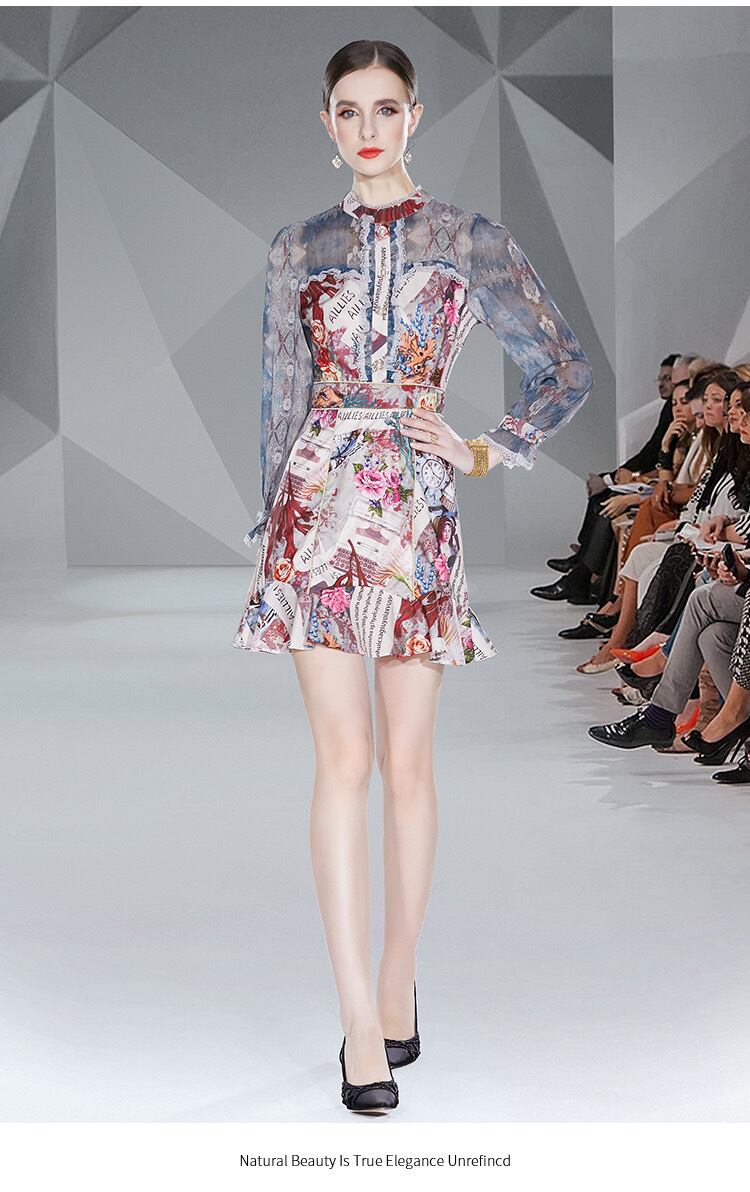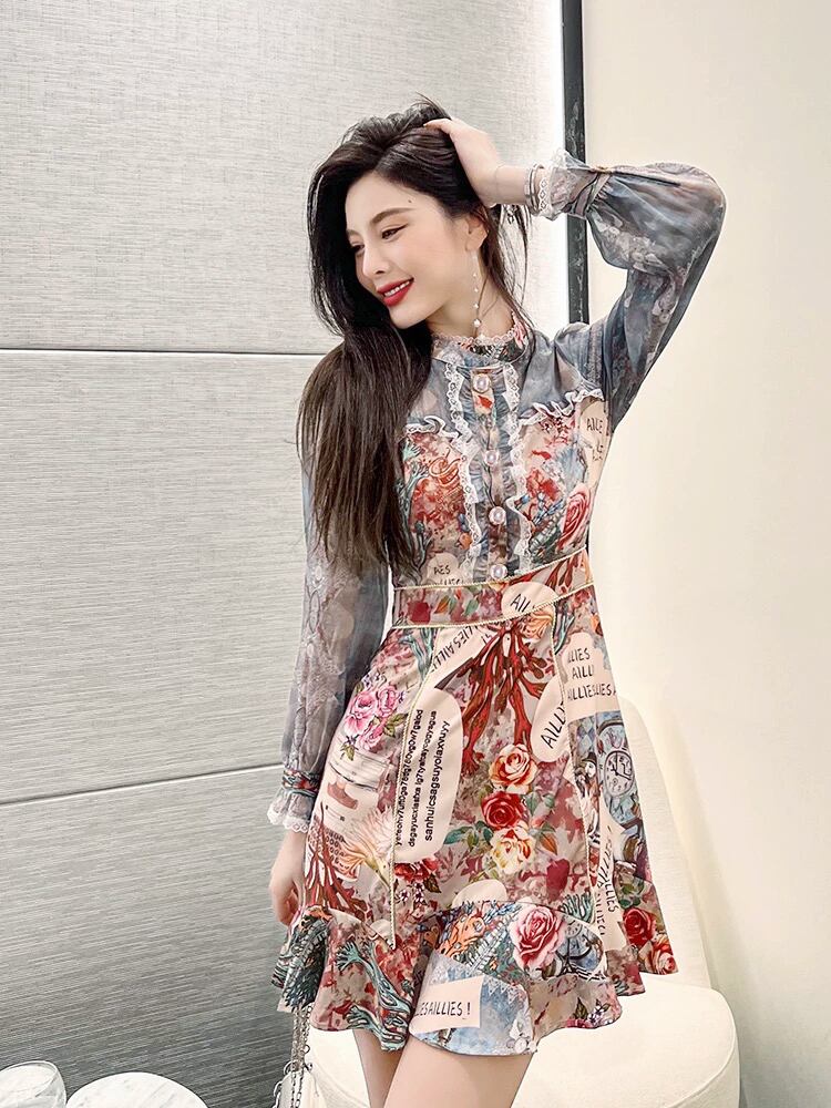Pinkoz ヴィンテージ フレンチ バロック パターン プリント スタンド カラー パッチワーク シャーリング ボタン レース ミニ マーメイド ドレス パーティー ナイト クロス ピンク ビンテージ