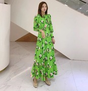 Pinkoz 滑走路デザイナー スタイリッシュな緑ピンクの花プリント ハイウエスト マキシ ドレス女性秋自由奔放に生きるフル スリーブ ローブ デ mujer ハイウェスト オータム 秋物 グリーン フラワーデザイン