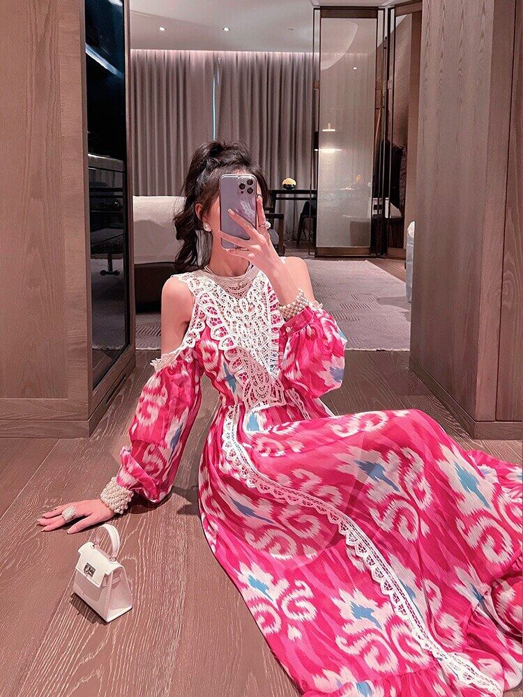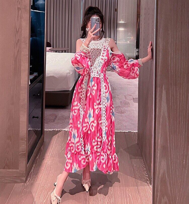 Pinkoz 滑走路デザイナー ブルゴーニュ花柄オフショルダー ランタン スリーブ ミディ ドレス パッチワーク レース ハイ ストリート vestidos ピンク ランタンスリーブ
