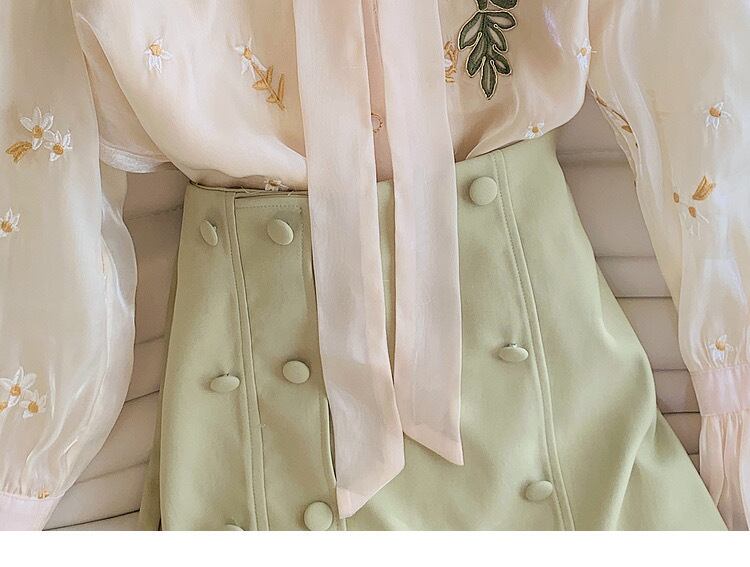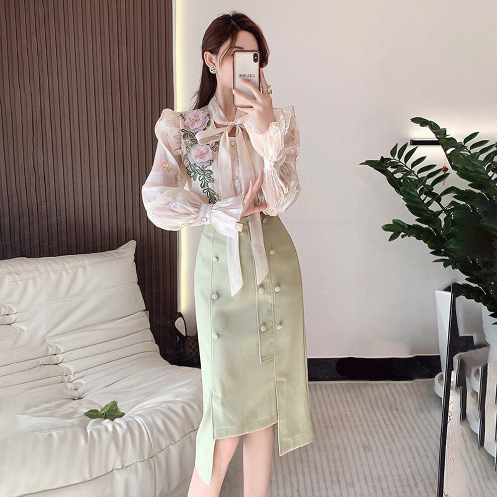 Pinkoz 女性 2 点セット ファム エレガントなシフォン弓襟 3D フラワー アップリケ ブラウス グリーン不規則なミディ スカート衣装 traf ピンク リボン フェミニン フラワーデザイン
