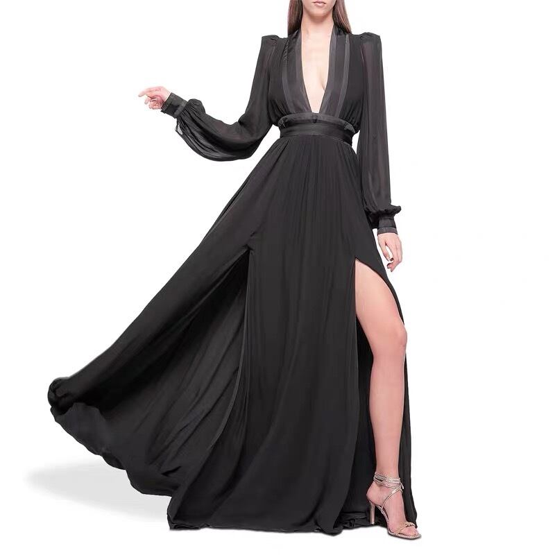 Pinkoz ランウェイ パーティー ドレス イエロー ディープ V ネック ランタン スリーブ シフォン レースアップ ラグジュアリー ナイト マキシ ロング ドレス ローブ デ ムジェ ヴィンテージ ピンク ランタンスリーブ Vネック ビンテージ