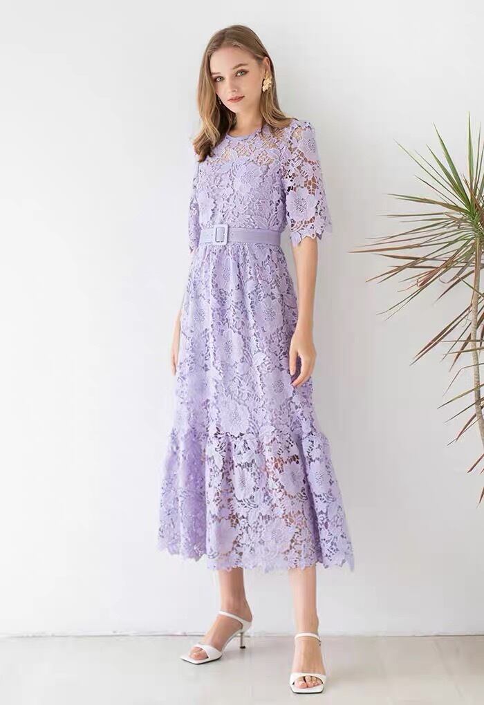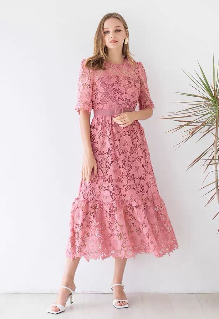 Pinkoz 女性デザイン スタイリッシュな半袖ミディ ドレス レース中空アウト エレガントなパーティー ナイト ドレス シックなローブ デ mujer ショート ピンク ハーフスリーブ