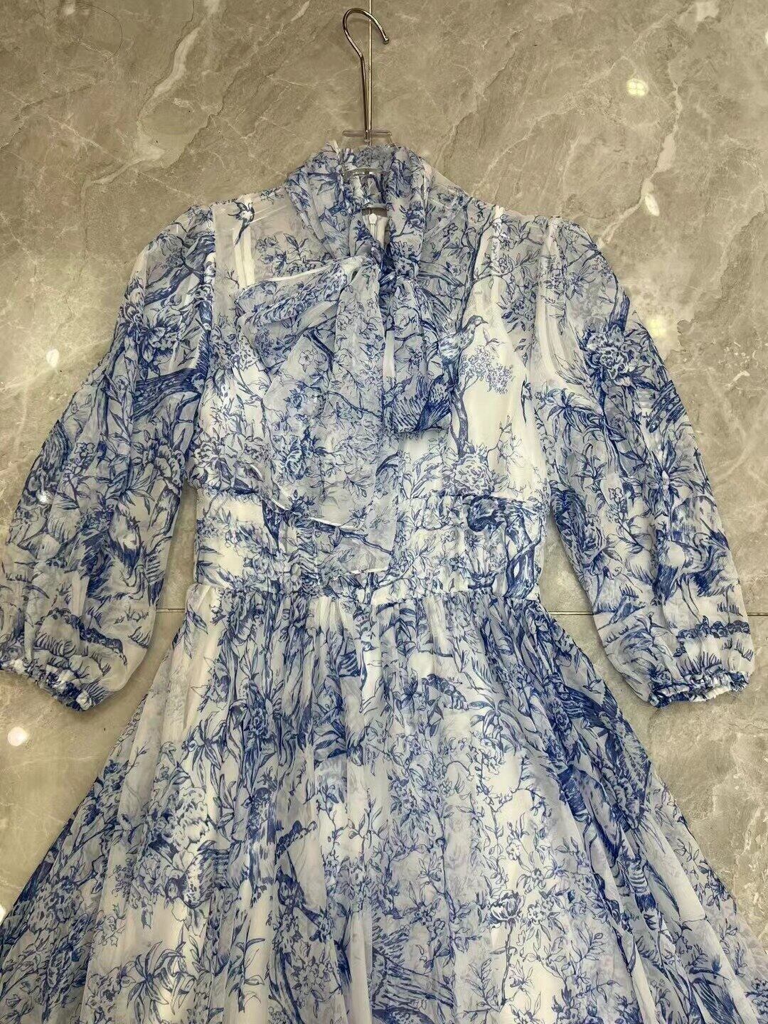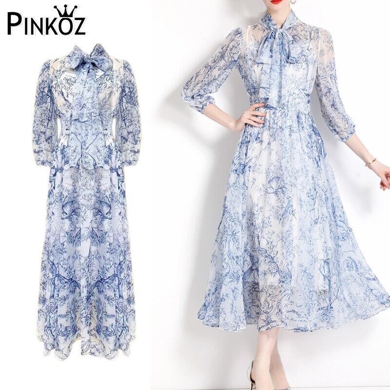 Pinkoz ランウェイ デザイナー ブルー グレー フローラル プリント シフォン y ミディ ドレス ボウ カラー サマー シックな vestidos traf za ピンク リボン 夏物 花柄
