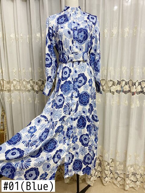 Pinkoz 女性デザイナーブルーフローラルプリントシングルブレストマキシドレス長袖春秋ボタンドレス休日とベルト ロング ピンク スプリング 春物 オータム 秋物 ハーネス 花柄