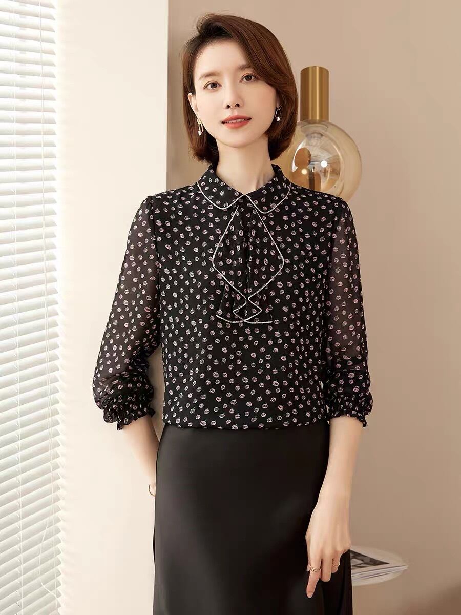 Pinkoz エレガントな女性シャツ水玉弓ターンダウン襟夏春黒ブラウスシフォン日常のファッション衣類ストリートウェア ピンク ブラック リボン スプリング 春物 サマー 夏物