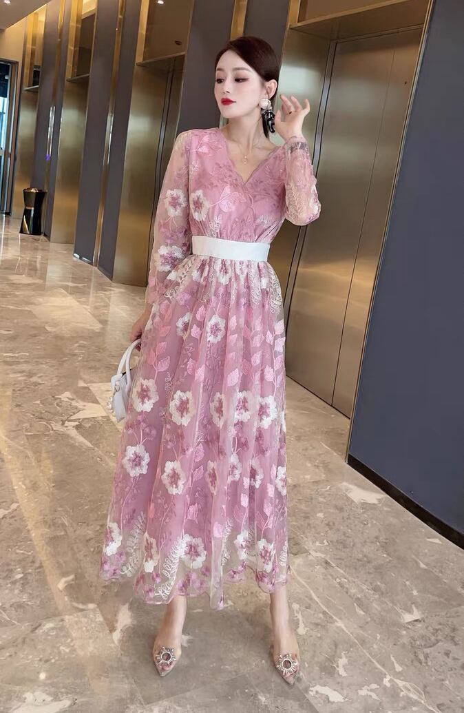 Pinkoz ヴィンテージ デザイナー スタイリッシュなミディ ドレス フルスリーブ メッシュ v ネック ハイ ウエスト ファッション衣類ピンクの花刺繍 vestidos ハイウェスト Vネック フラワーデザイン ビンテージ