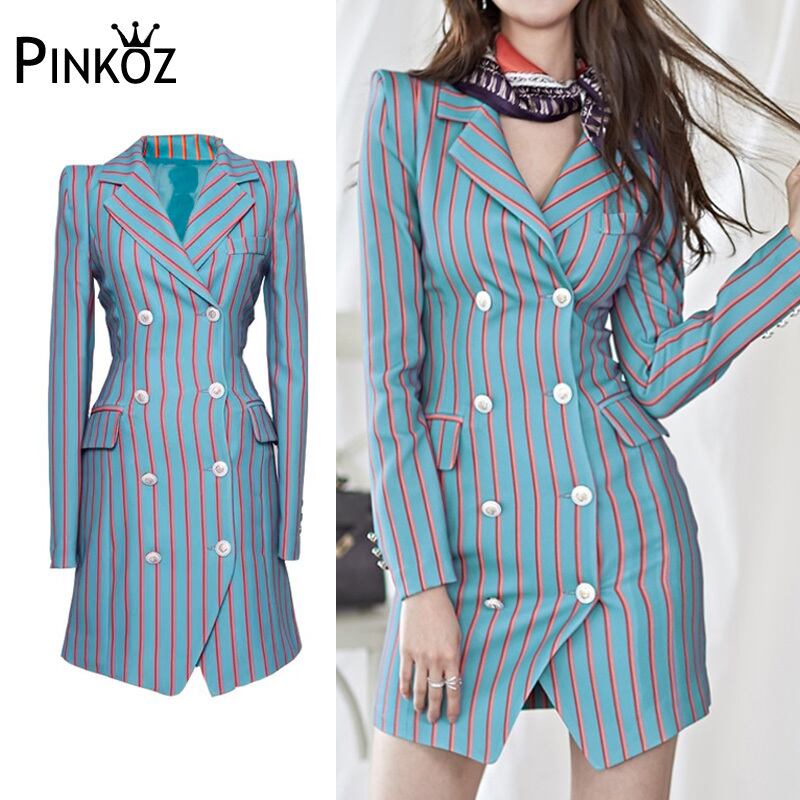 Pinkoz 女性デザイナーストライプダブルブレストノッチネックブレザーミニドレス女性 OL エレガントなブルードレスローブデ mujer 新しい ピンク