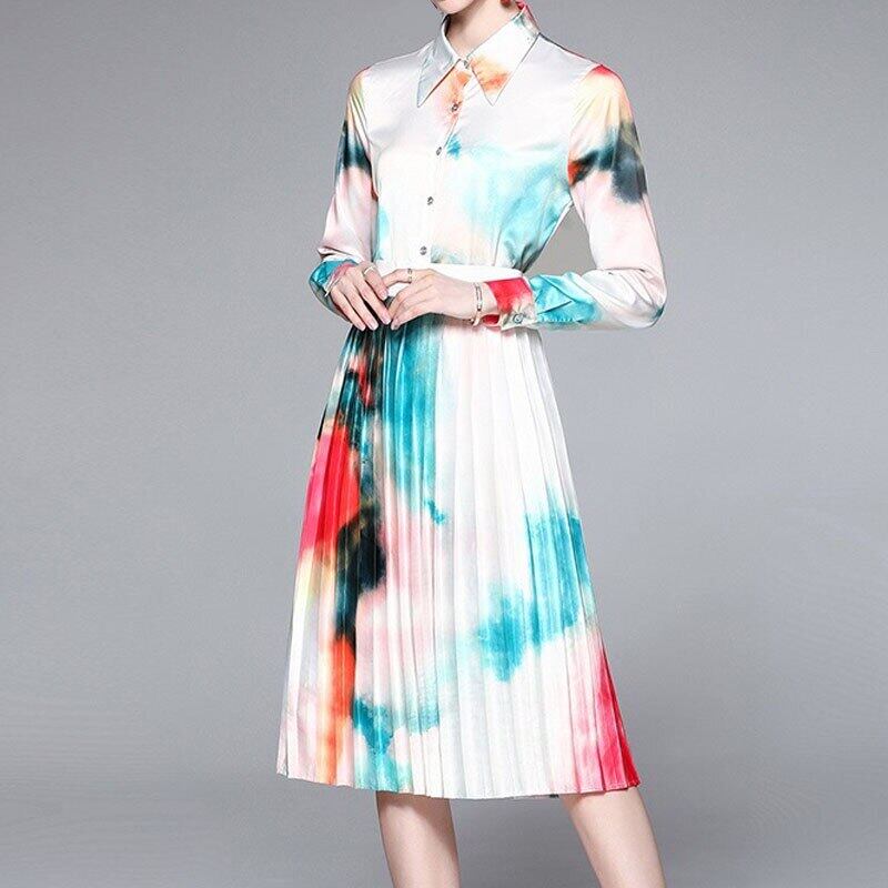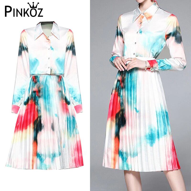Pinkoz デザイナー ヒットカラー グラデーション柄 プリント 2点セット レディース オフィスレディ シャツ ブラウス プリーツスカート セット ワンピース 秋 ピンク オータム 秋物 会社 学校 通勤や通学にも