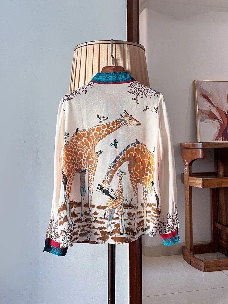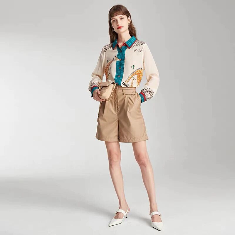 Pinkoz 秋 レディース 長袖 シャツ フレンチ おしゃれ サテン スリム キャリッジ プリント レディース トップス アニマル ブラウス ロング ピンク オータム 秋物