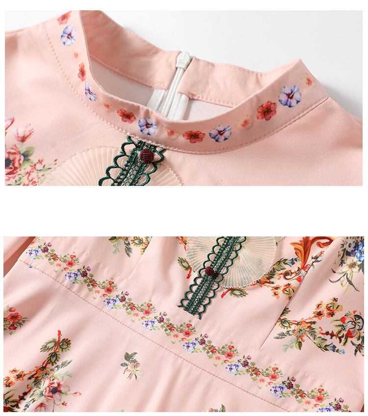 Pinkoz 滑走路デザイナーピンク花柄スタンドカラー女性フリルフルスリーブボタンパーティーカジュアルミニドレス vestidos 新 ラッフル
