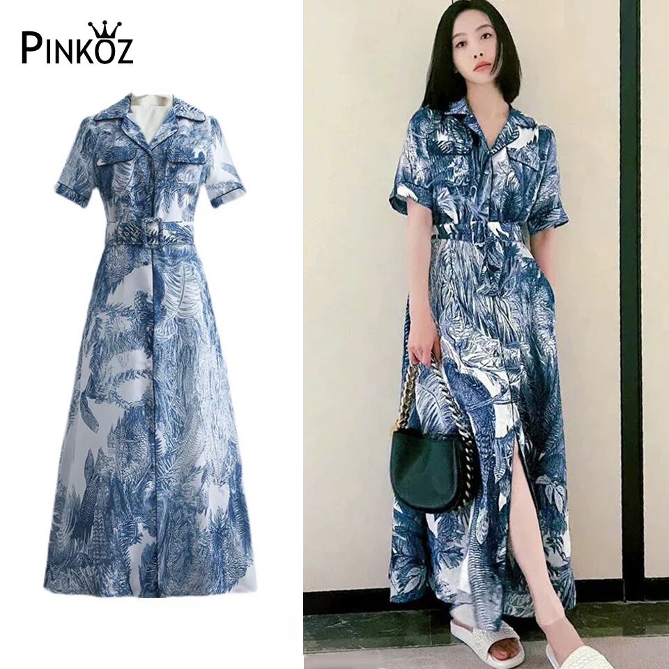 Pinkoz エレガントなファッション衣類半袖秋セレブスタイリッシュな花柄プリントターンダウン襟マキシロングドレス vestidos ショート ピンク ハーフスリーブ オータム 秋物