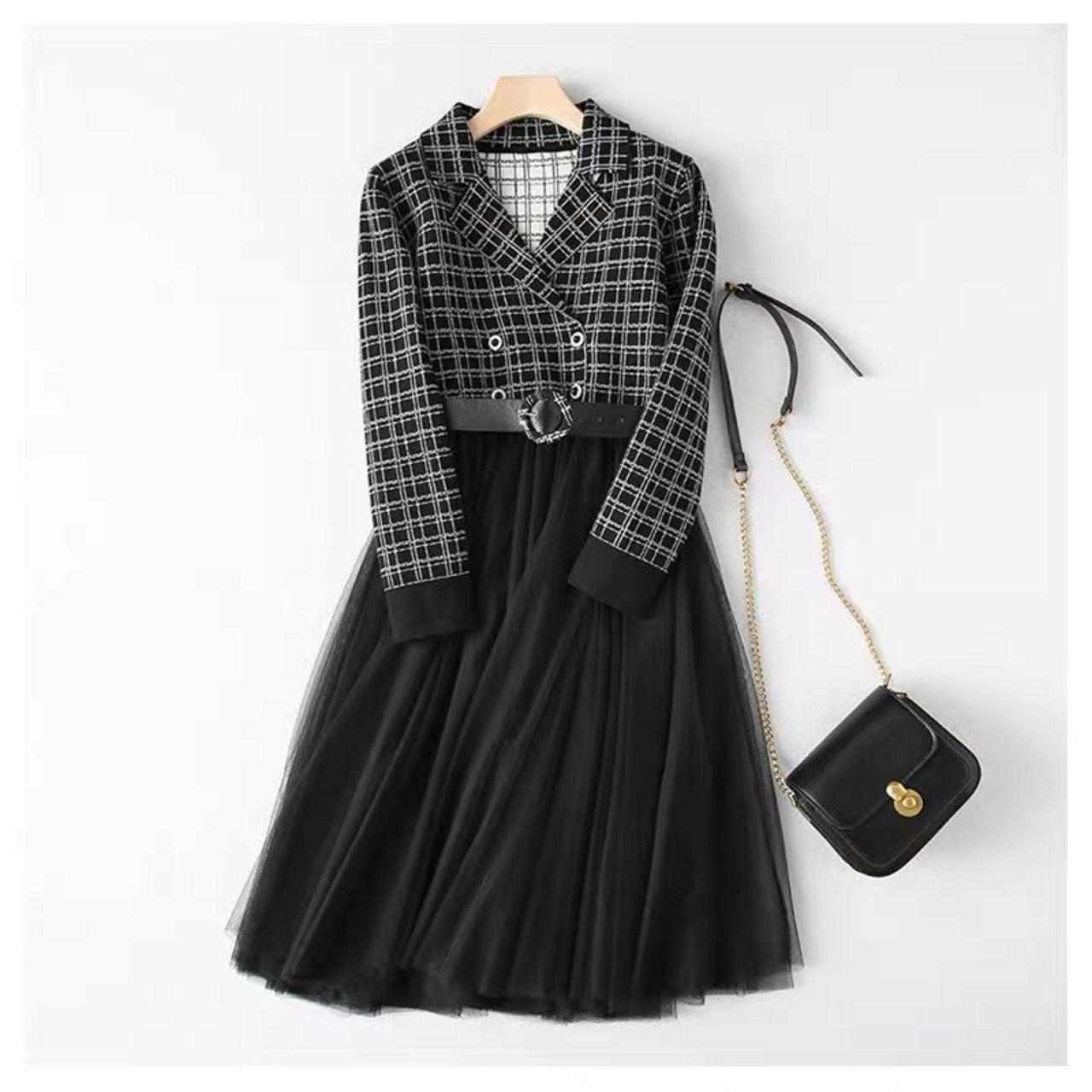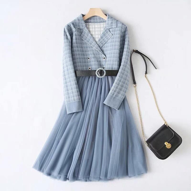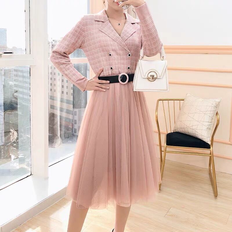 Pinkoz エレガント オフィスレディ ミディドレス ピンク チェック柄 ノッチネック パッチワーク メッシュ Aラインドレス ベルト付き 秋冬物 座 オータム 秋物 ウィンター ハーネス 会社 学校 通勤や通学にも