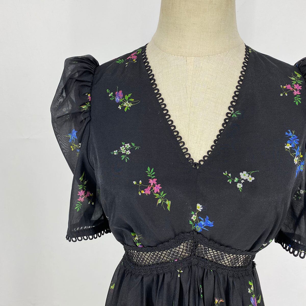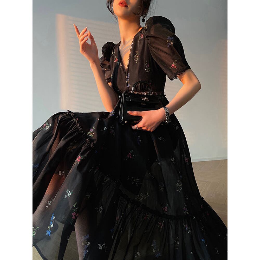 Pinkoz ヴィンテージ フレンチ v ネック パフ スリーブ花柄プリント新しいファッション ロング ドレス黒ゴシック パーティー ナイト ドレス vestidos za ピンク ブラック Vネック ビンテージ