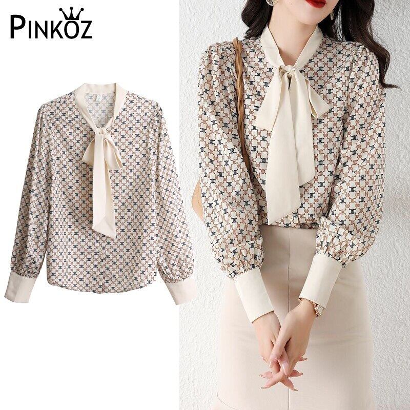 Pinkoz リボン ブラウス レディース チェック柄 プリント 長袖シャツ ルーズ ターンダウン カラー トップス Ropa ロング ピンク