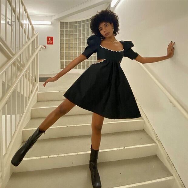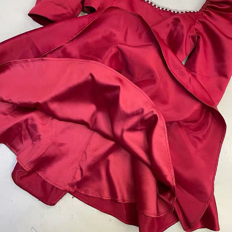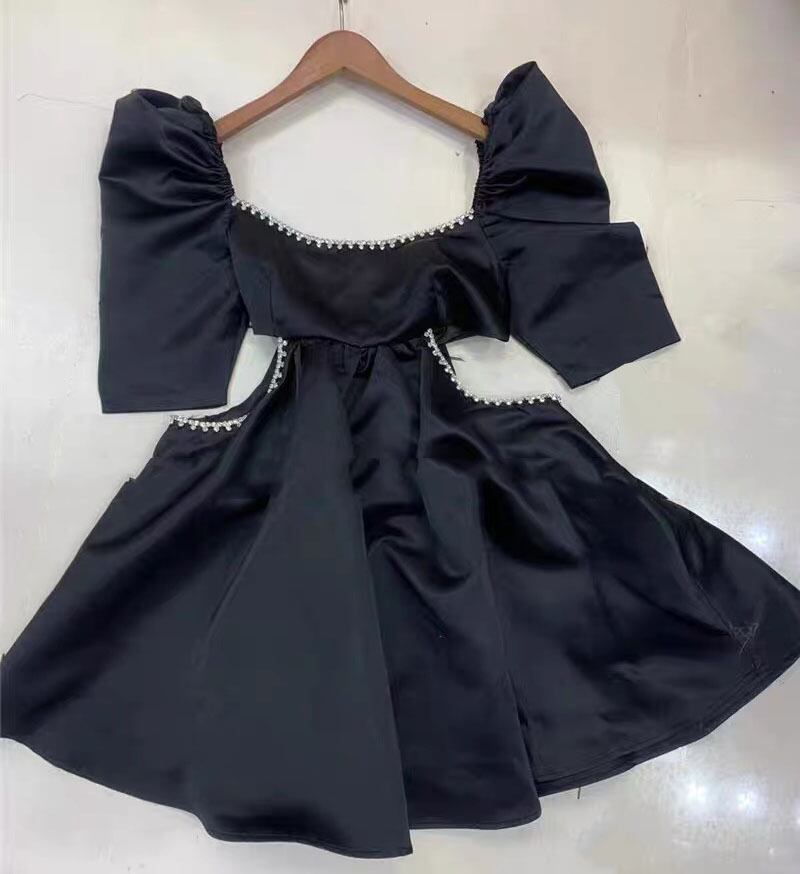 Pinkoz 滑走路デザイナー赤い正方形の襟パフ スリーブ夏の高級パーティー ミニ ドレス サテン中空アウト クリスタル ビーズ ドレス za ピンク レッド サマー 夏物 スクウェア