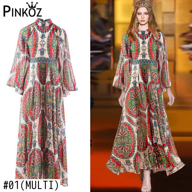 Pinkoz 女性滑走路デザイナー マキシ ドレス スタンド襟フレア スリーブ高級ロング ドレス パーティー ローブ デ mujer フェスティバル vestidos traf ピンク フレアスリーブ