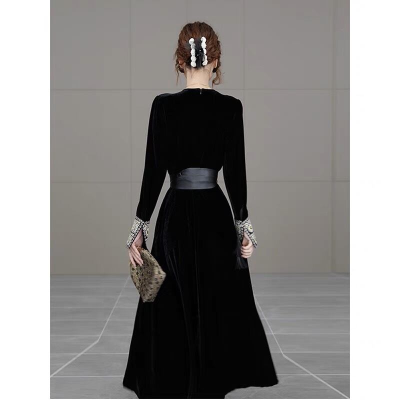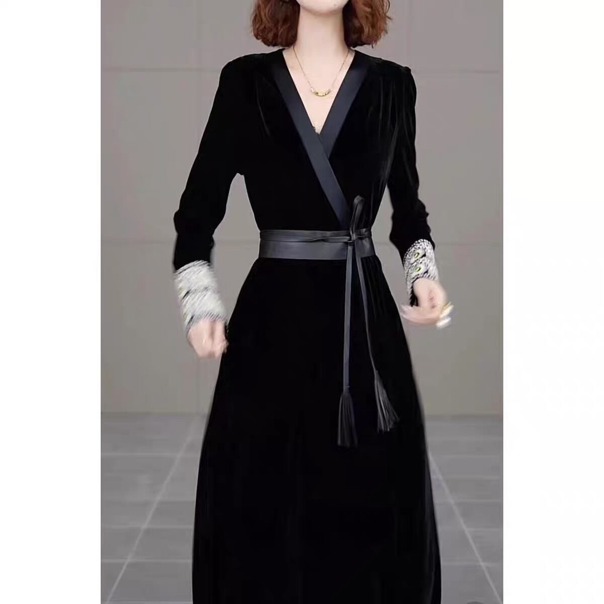 Pinkoz 女性黒ベルベット ゴシック ミディ ドレス v ネック秋冬時装服ファム長袖パッチワーク ローブ ベルト ロング ピンク ブラック オータム 秋物 ウィンター 冬物 ハーネス Vネック フェミニン
