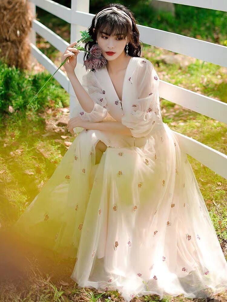 Pinkoz ランウェイ デザイナー ベージュ フラワー アップリケ シングル ブレスト メッシュ v ネック ミディ ドレス スウィート ヤング エレガント パーティー ドレス ナヴィダード ピンク 大人ガーリー キュート カジュアル Vネック フラワーデザイン