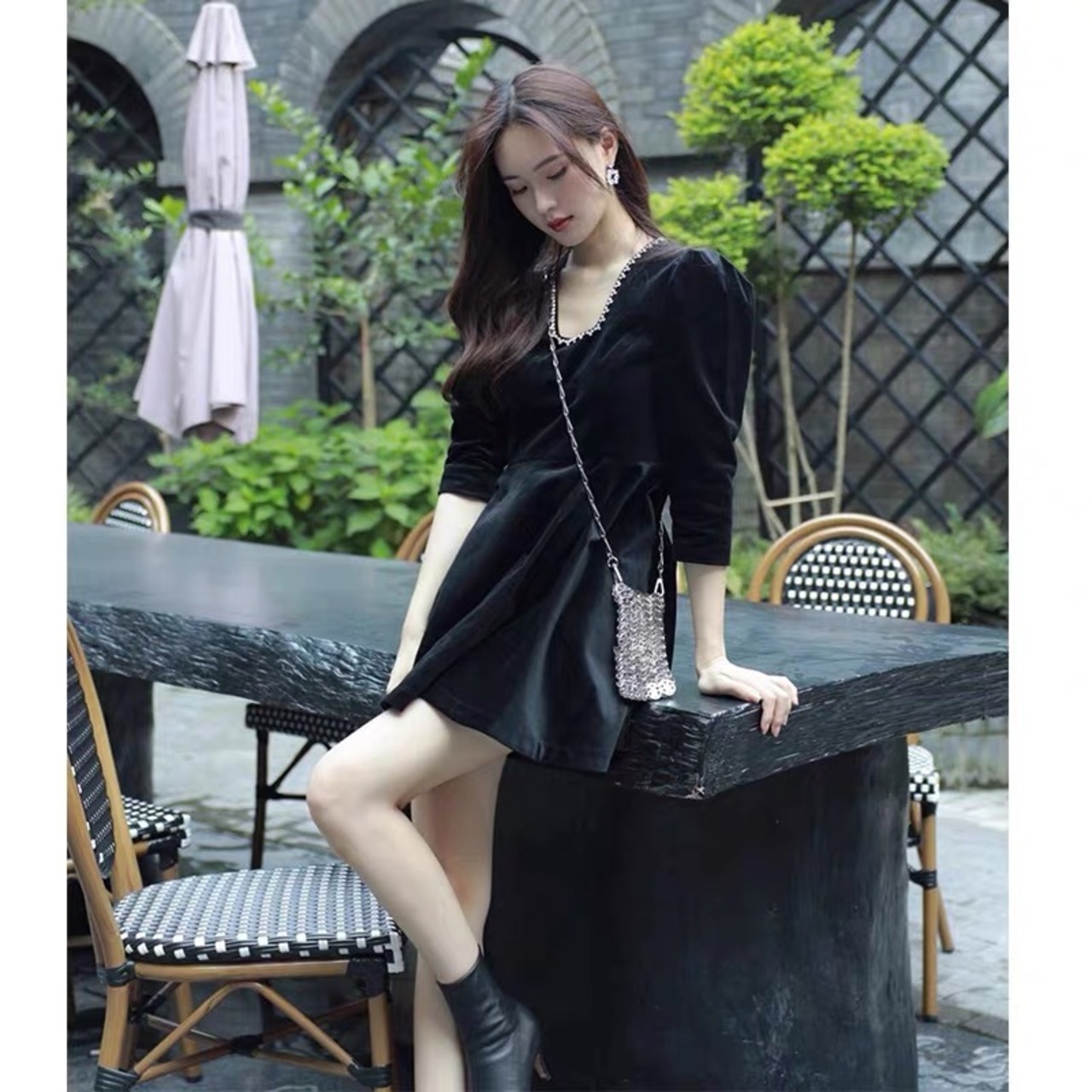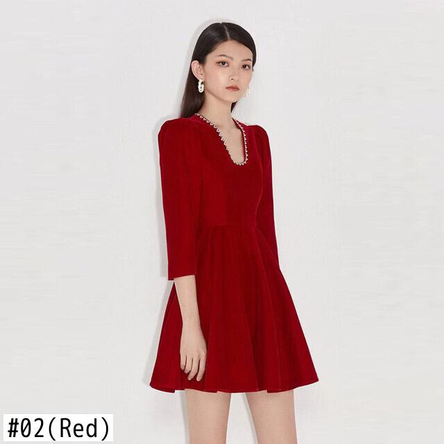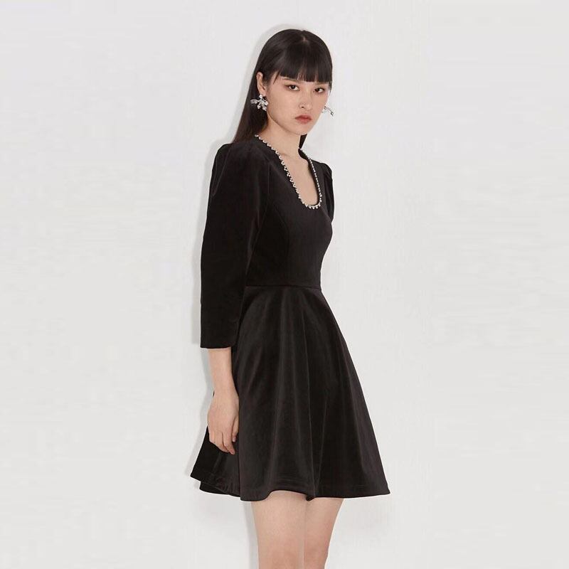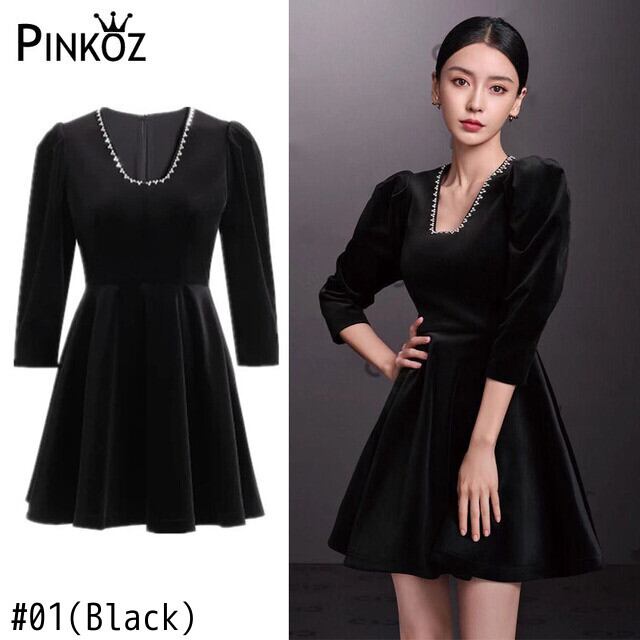 Pinkoz デザイナー シンプルなスクエア カラー ベルベット ビーズ ブラック ミニ ドレス パーティー カジュアル クリスタル ハイ ウエスト ディナー エレガント ドレス ローブ ハイウェスト ピンク スクウェア