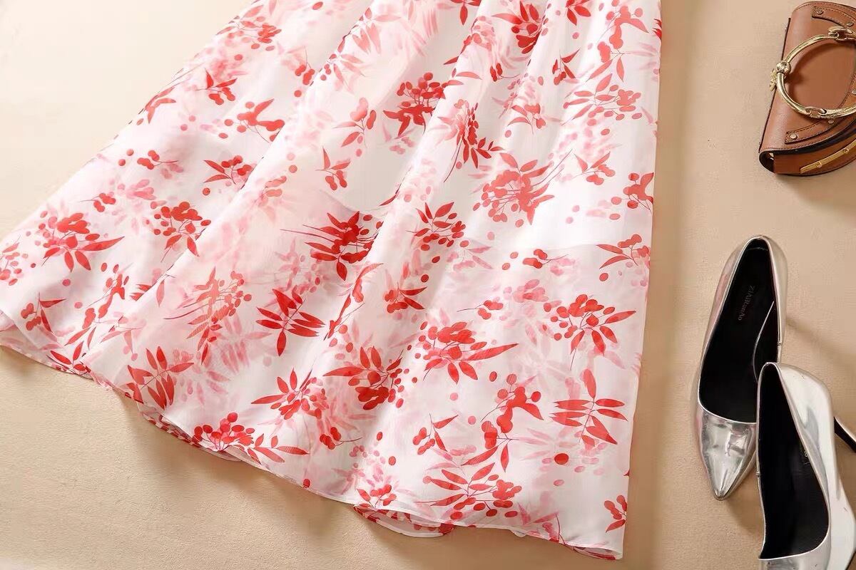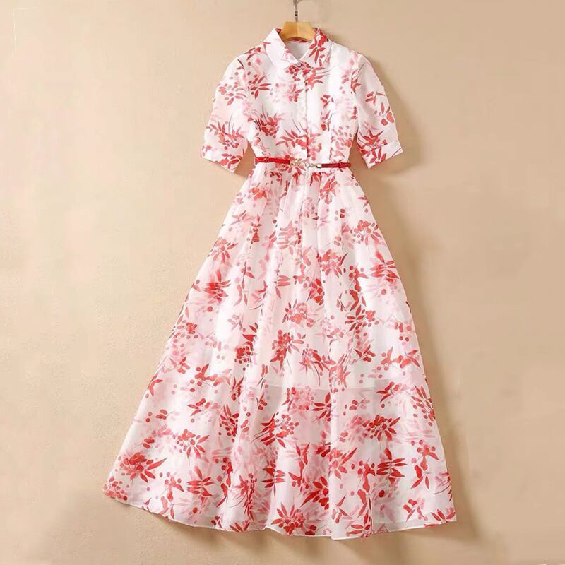 Pinkoz 女性デザイナー赤いカエデの葉花柄プリント ターン ダウン襟ミディ シャツ ドレス エレガントなファム シックな vestidos ヴィンテージ OL ピンク レッド フェミニン ビンテージ
