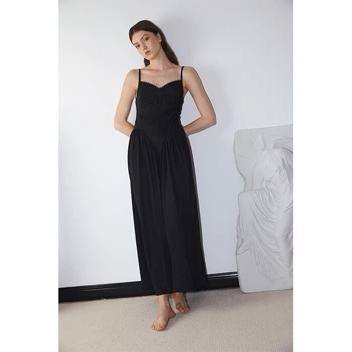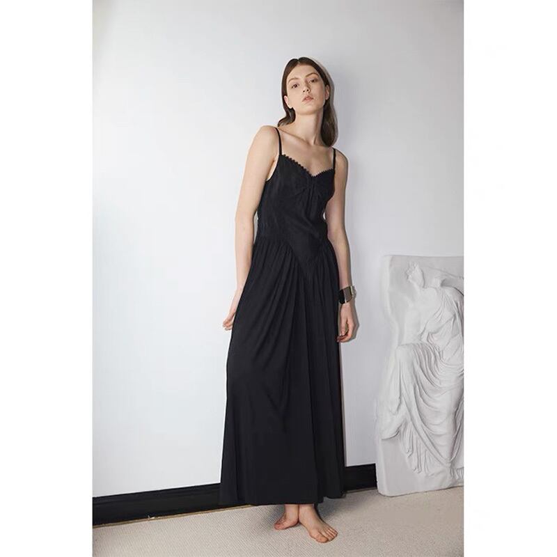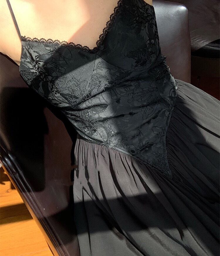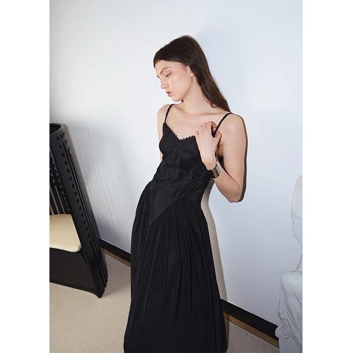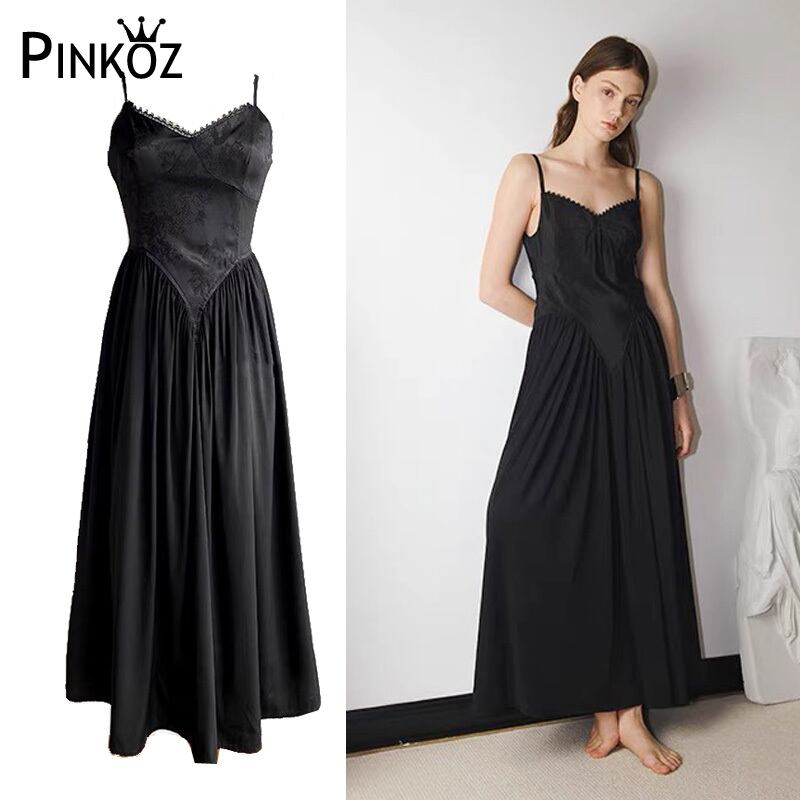 Pinkoz デザイナー黒ヘップバーン エレガントなスパゲッティ ストラップ ミディ ドレス ハイ ウエスト パッチワーク ベルベット刺繍パーティー シックなドレス ローブ ハイウェスト ピンク ブラック