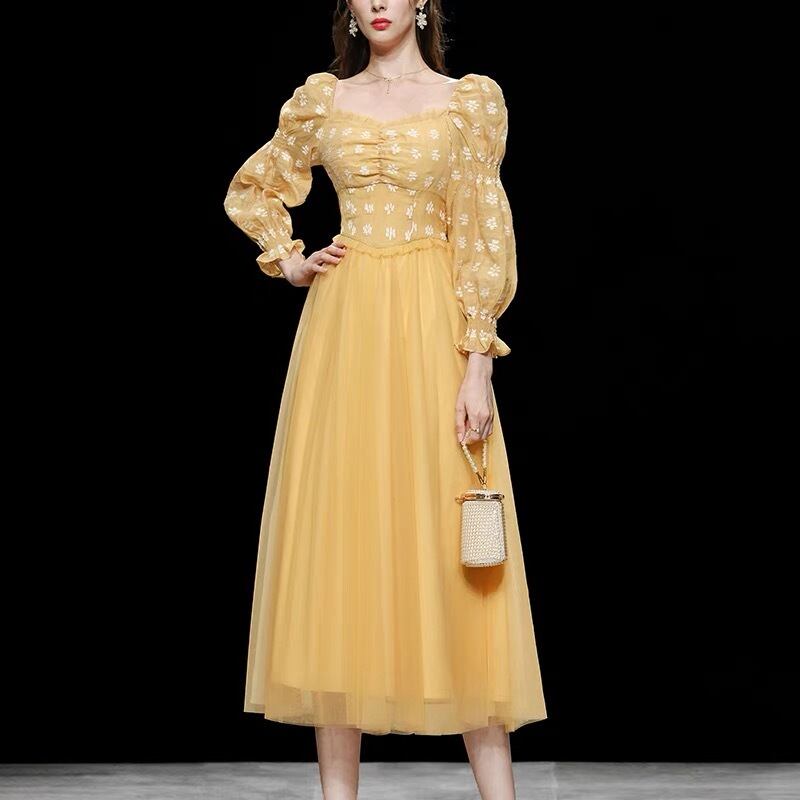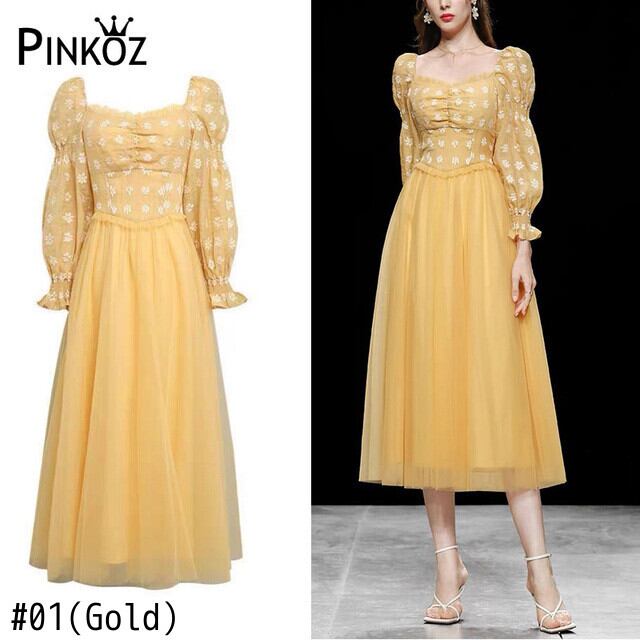 Pinkoz ヴィンテージ デザイナー イエロー スクエア恋人ネック フル スリーブ パーティー フレンチ ミディ ドレス女性ゴールデン ローブ デ mujer vestido ピンク 大人ガーリー スウィート キュート カジュアル スクウェア ビンテージ