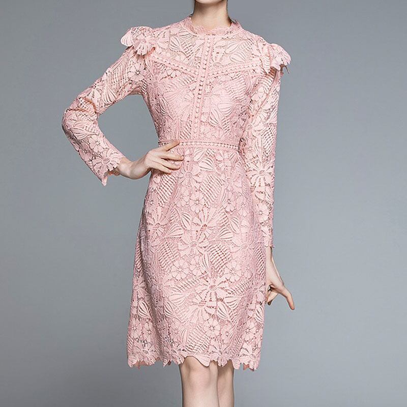 Pinkoz エレガントなヴィンテージ レトロなフリル長袖 A ライン膝丈ドレス中空女性パーティー ディナー カジュアル ローブ mujer ドレス ロング ピンク ラッフル Aライン ビンテージ
