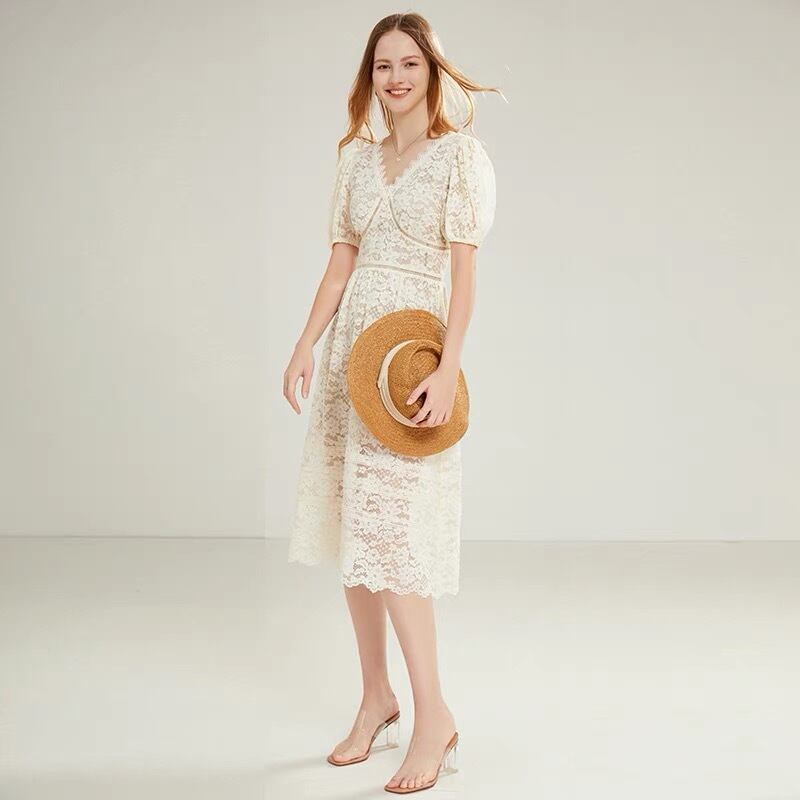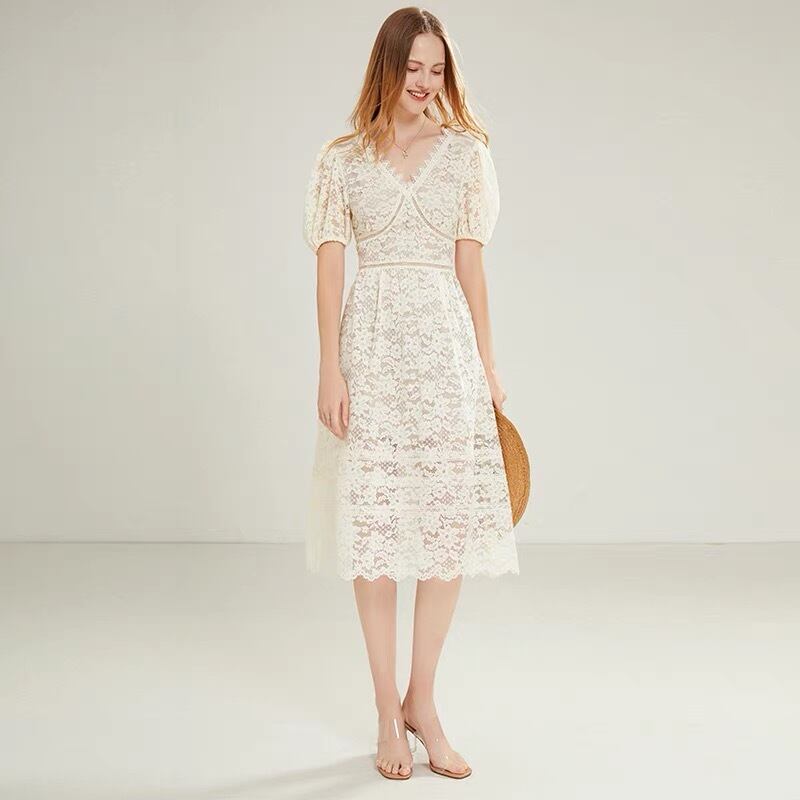 Pinkoz 滑走路夏の女性ハーフスリーブウエストサッシュレースパッチワークロングパーティードレス v ネックボタンヴィンテージ ピンク 半袖 サマー 夏物 Vネック ビンテージ