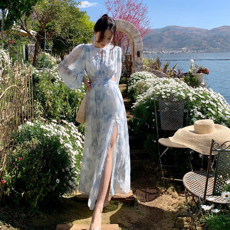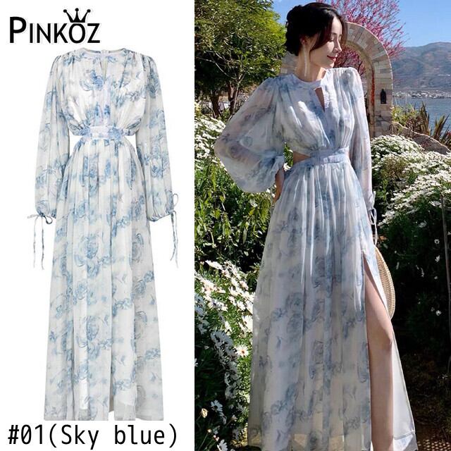 Pinkoz デザイナー ヴィンテージ水墨画ローズ プリント O ネック中空アウト ランタン スリーブ ロング ドレス自由奔放に生きる休日ビーチ ドレス ファッション ピンク ランタンスリーブ Oネック ビンテージ