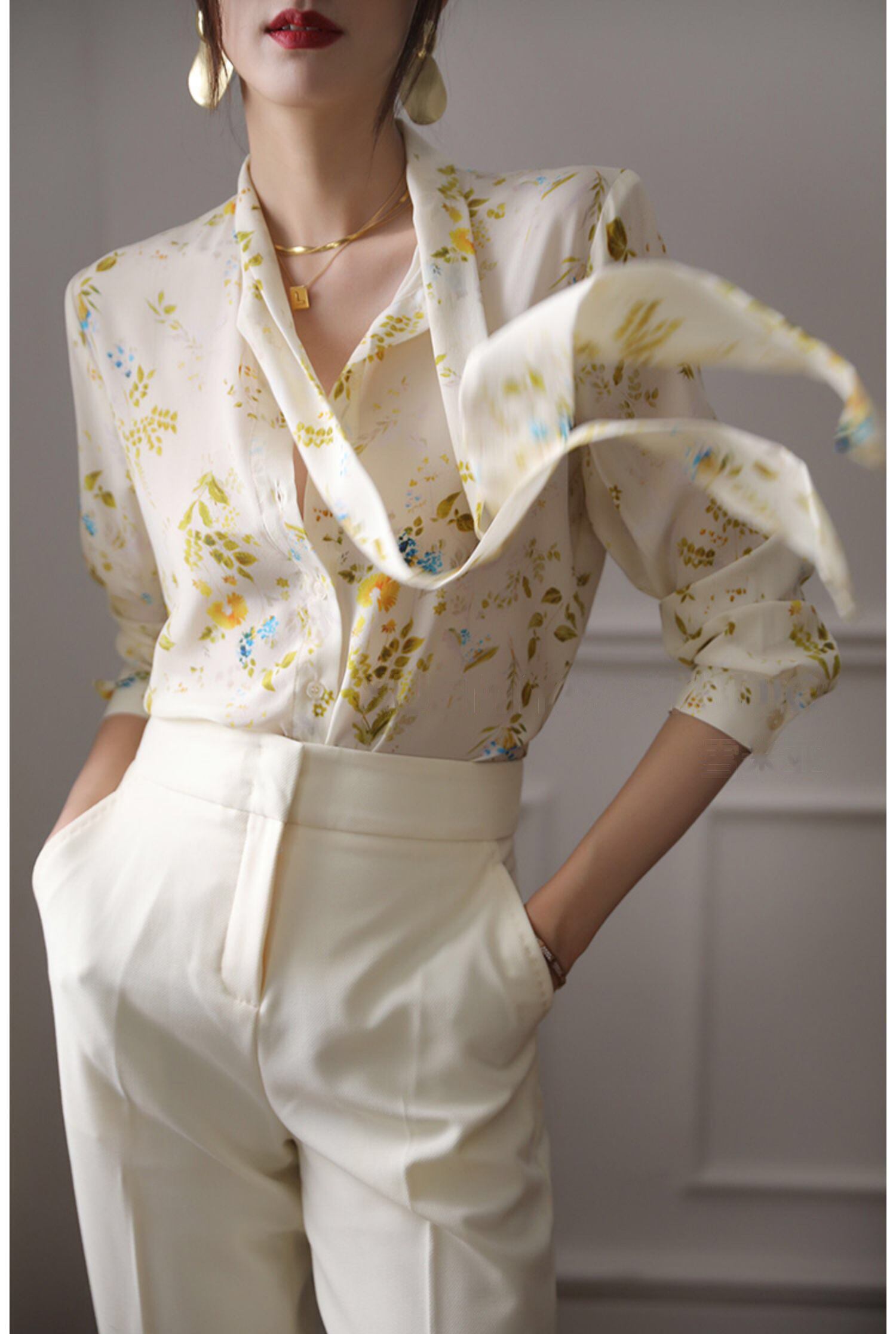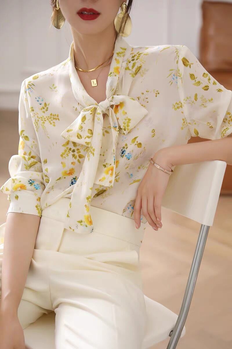 Pinkoz フレンチ リボン レース アップ シャツ女性のハイエンド デザイン長袖弓花柄トップ エレガントな黄色のプリント y シックなシャツ ロング ピンク レースアップ