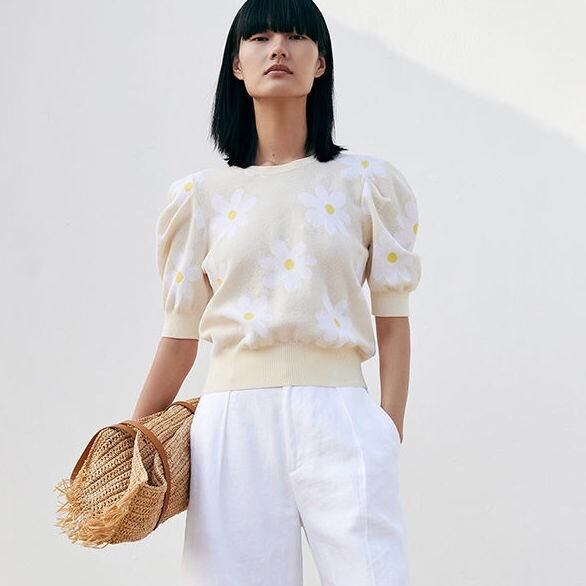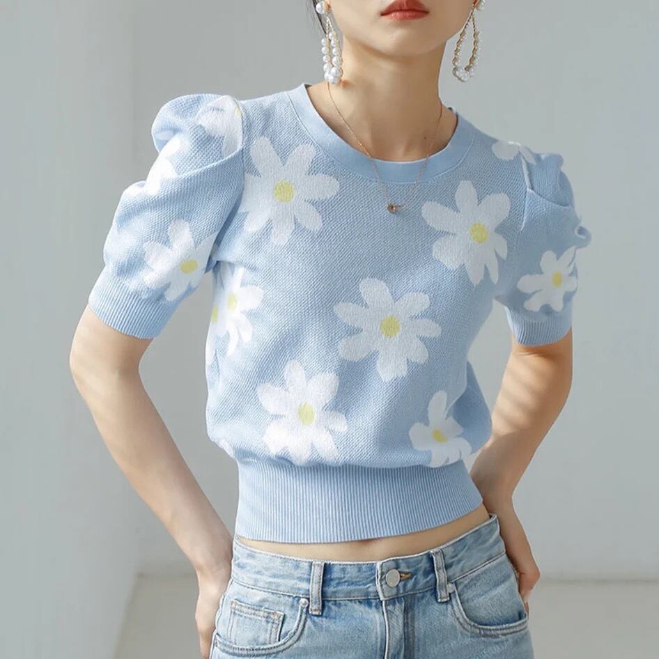 Pinkoz 有名人スタイリッシュなライトブルートップスデイジーフラワーニットカジュアル女性 Tシャツファッションシックな女性のセータープルオーバー traf ピンク フラワーデザイン