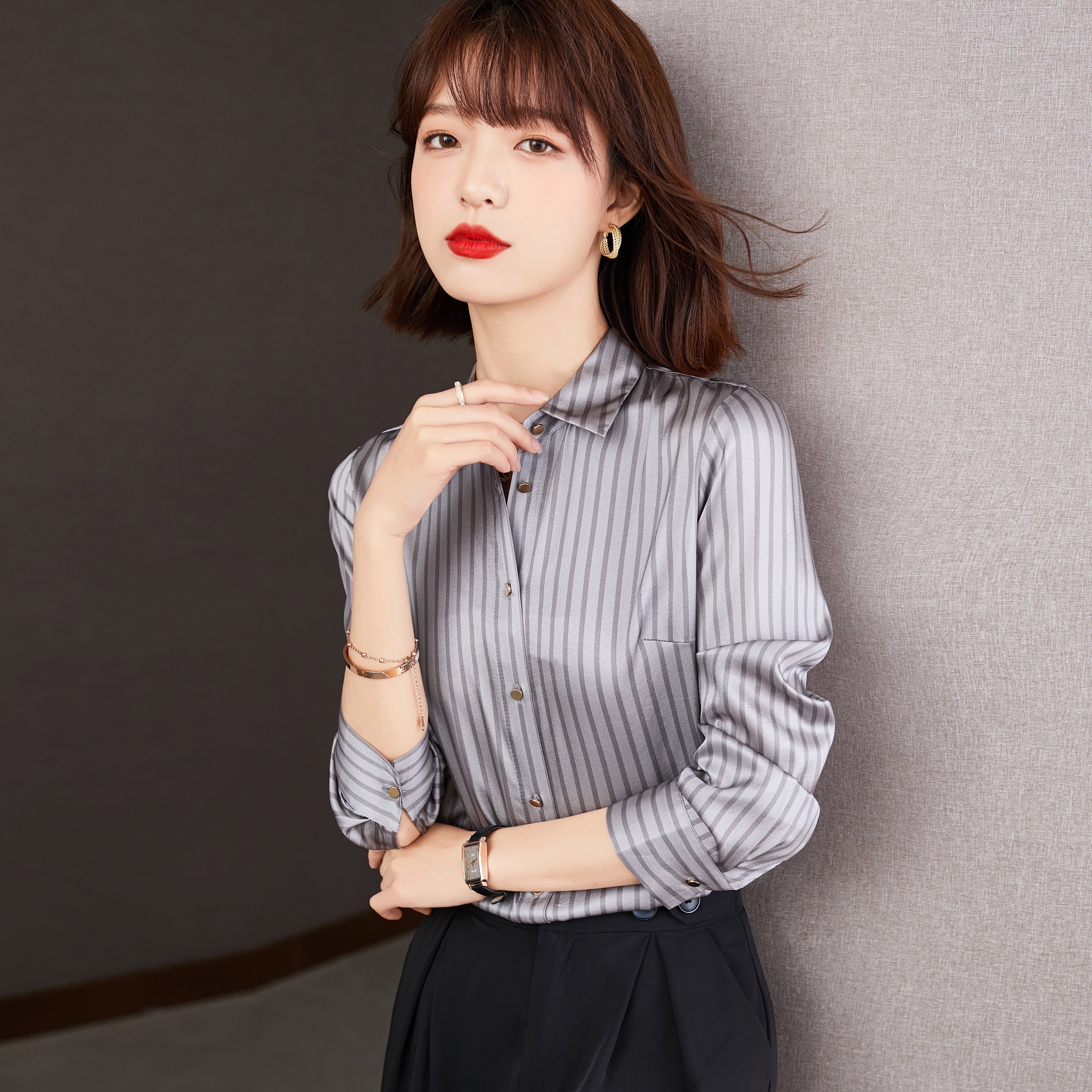 Pinkoz ヴィンテージ エレガントなデザイナー グレー ストライプ フルスリーブ女性トップス ブラウス春秋ワーク シャツ服シュミーズ ファム フレンチ ピンク スプリング 春物 オータム 秋物 フェミニン ビンテージ