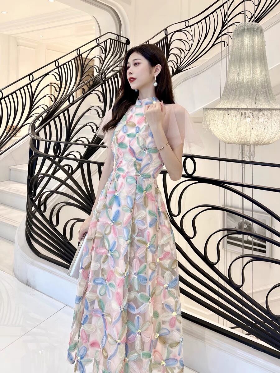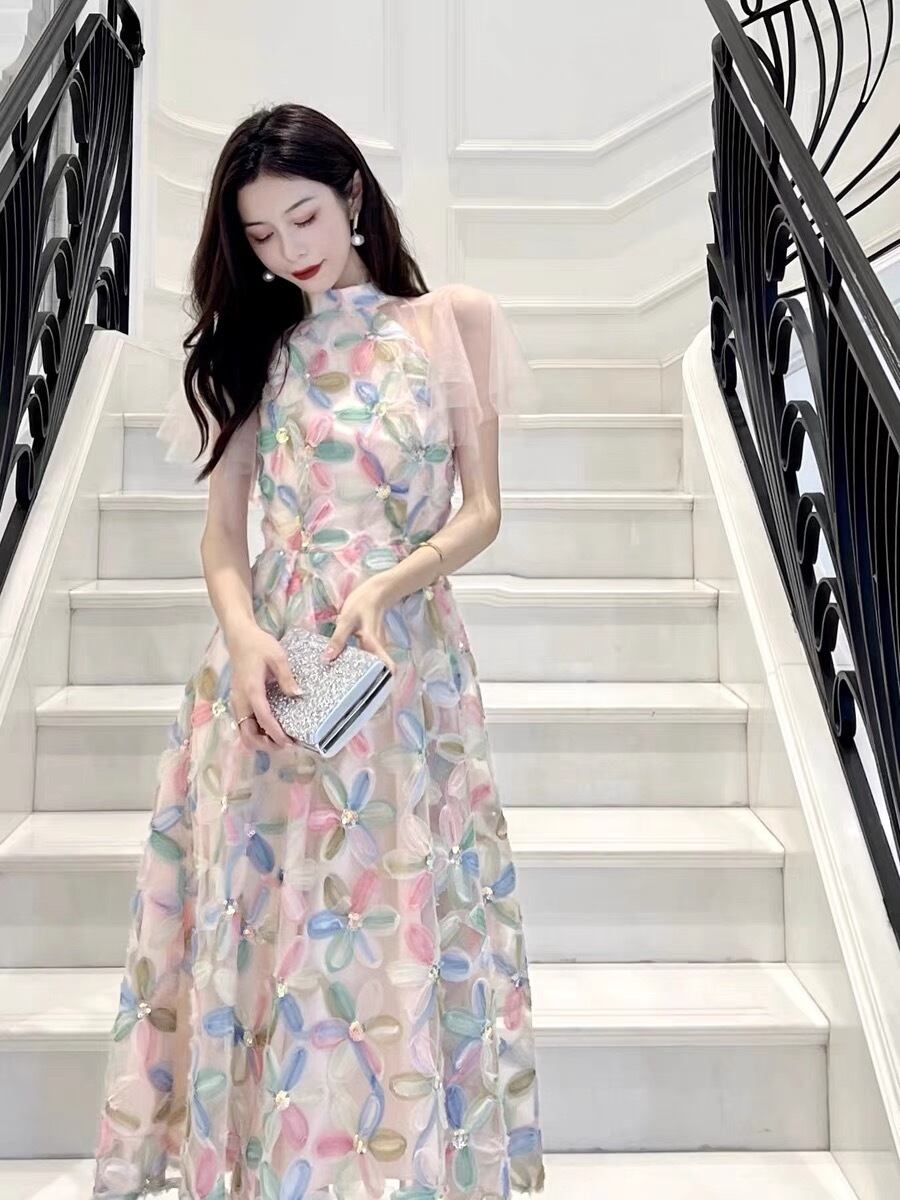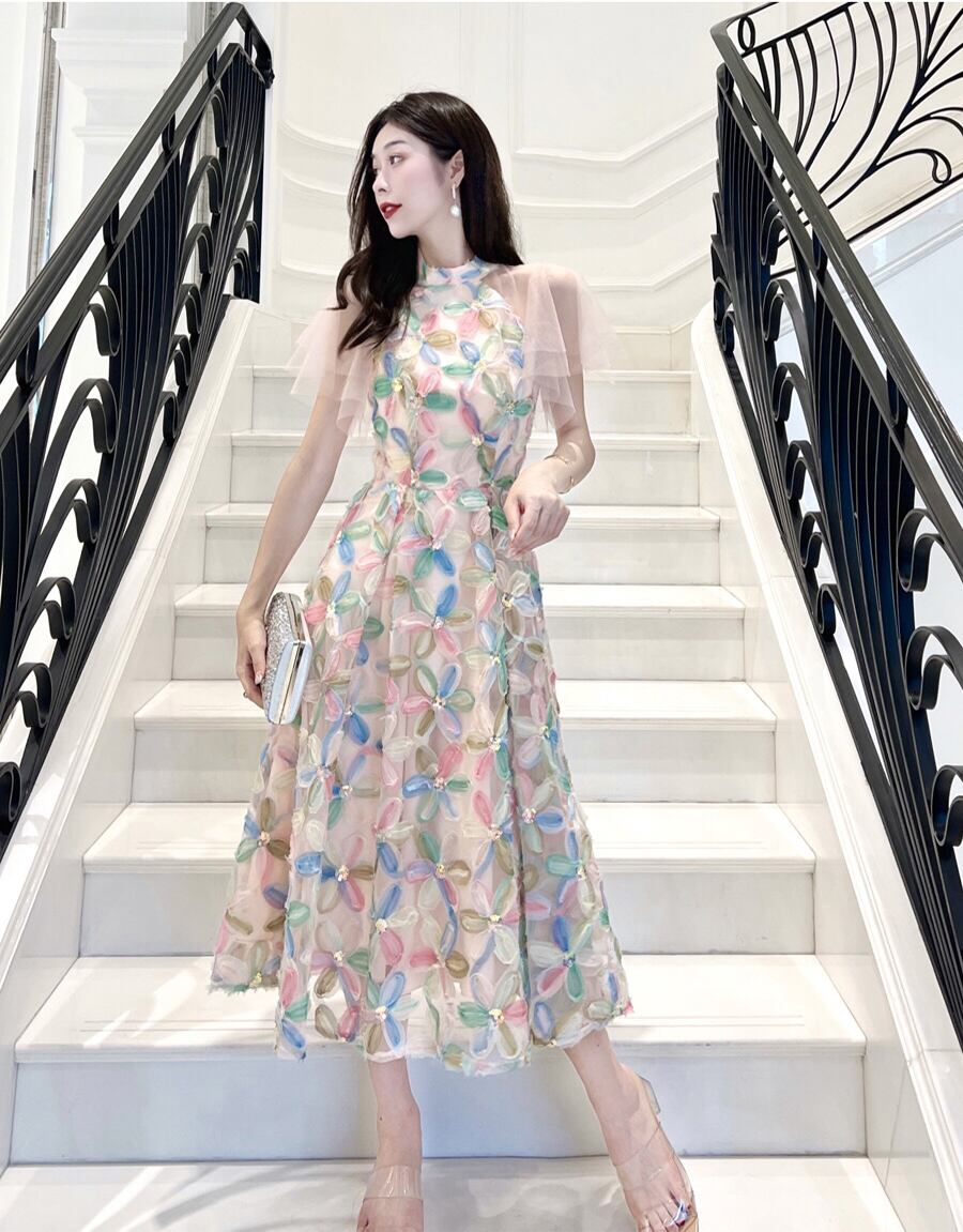 Pinkoz 女性高級刺繍メッシュドレスフェスタカクテルパーティーローブフローラルレース Vestidos ピンク 花柄