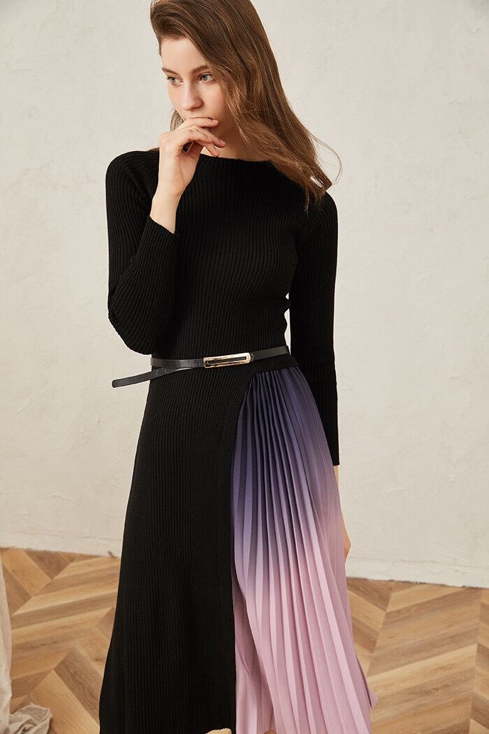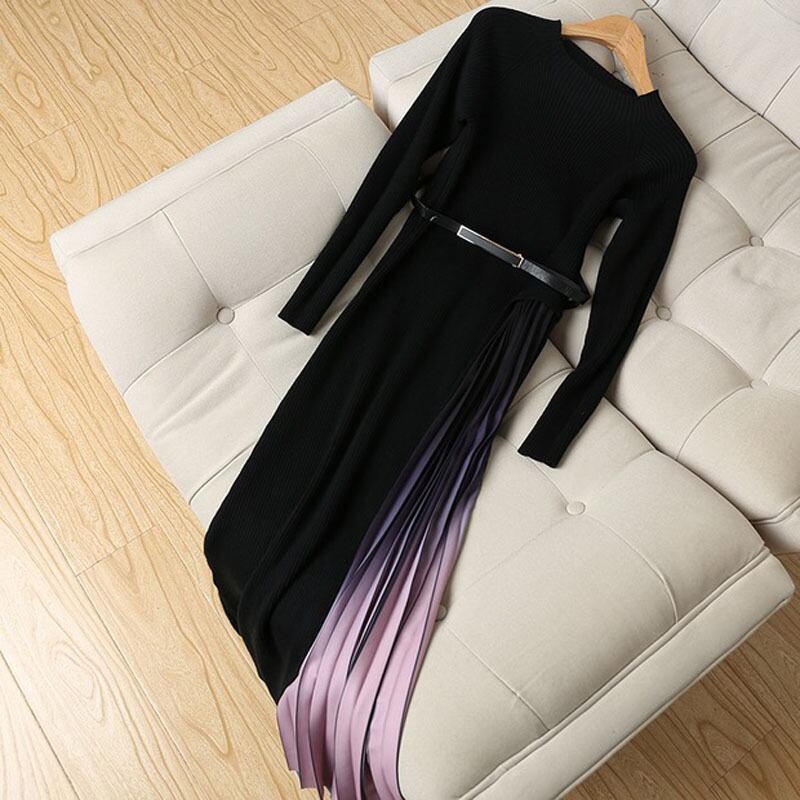 Pinkoz プラス サイズ 春のランウェイ ドレス レディース長袖パッチワーク プリーツ ミディ ドレス ニット スリム ドレス ロング ピンク 大きめサイズ スプリング 春物