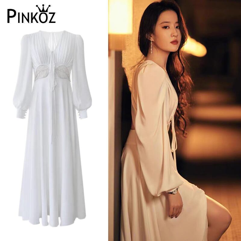 Pinkoz 有名人のスタイリッシュな白い妖精マキシ ドレス v ネック背中の開いたストローストリング レースアップ クリスタル ハイ ウエスト パーティー ウェディング ドレス新しい ハイウェスト ピンク ホワイト Vネック