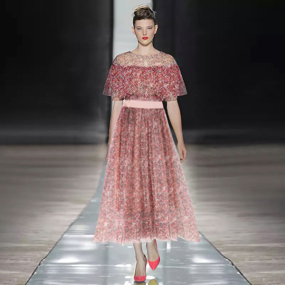 Pinkoz デザイナー花柄プリント シフォン スタンド カラー フリル女性 2 点セット ブラウス トップス ミディ スカート ファッション服ファム ピンク ラッフル フェミニン