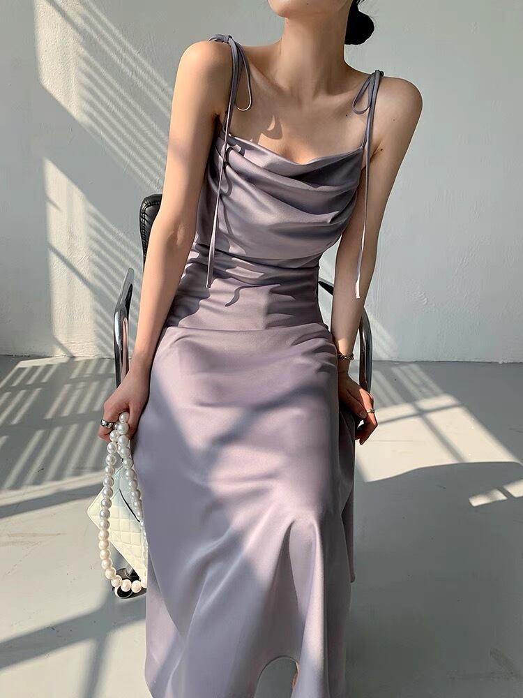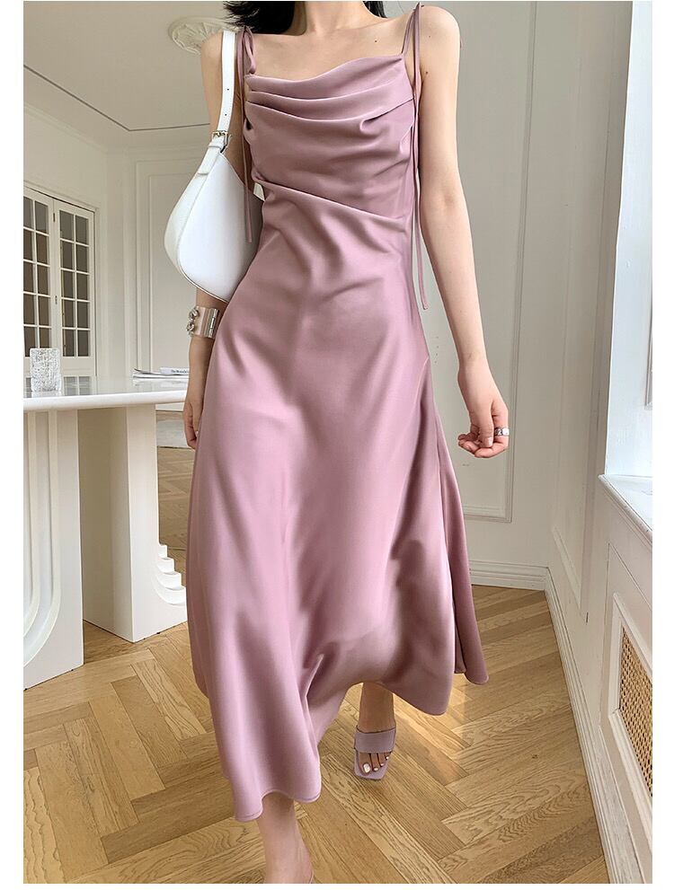 Pinkoz サテンドレス女性ノースリーブスパゲッティストラップシックな黒夏フレンチパーティーウェディングドレス Ruch ピンク ブラック サマー 夏物 シルク