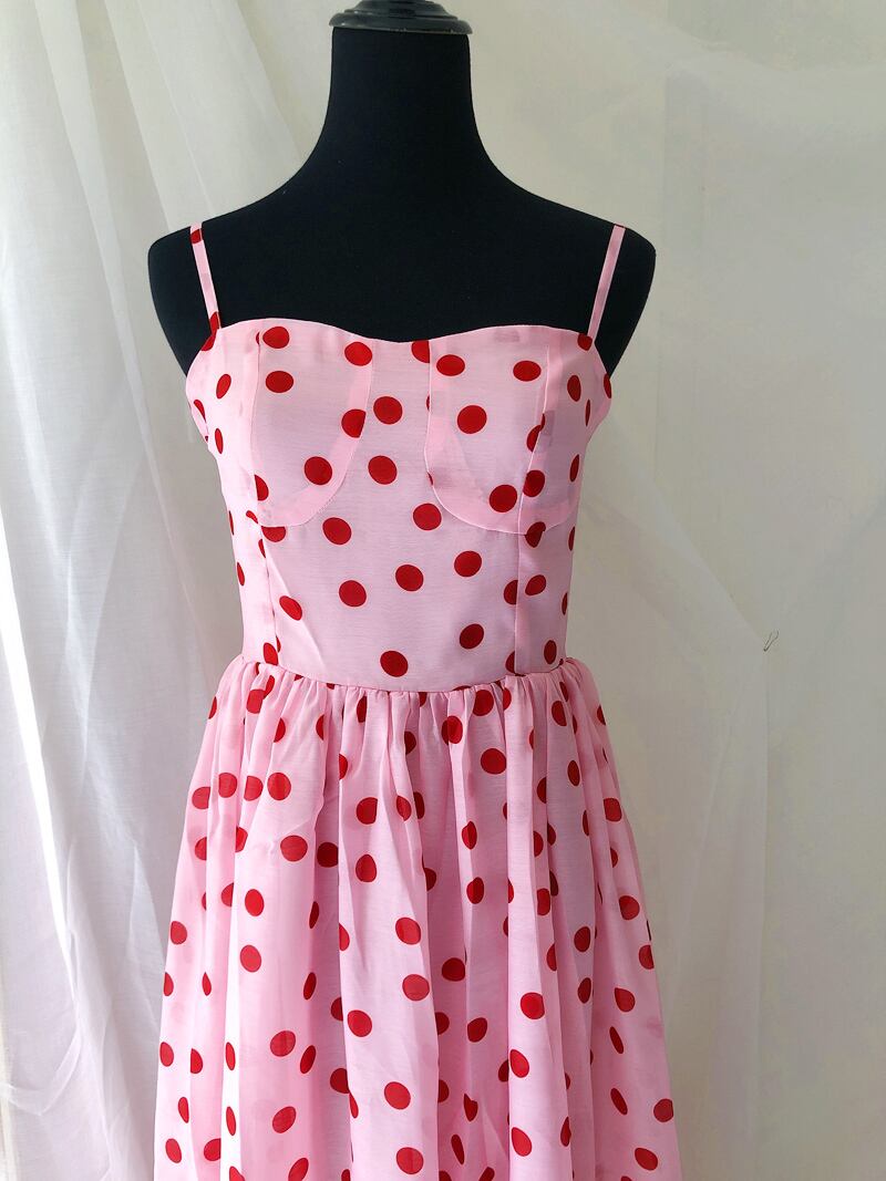Pinkoz 高級パーティー ミディ ドレス キャミソール ポルカ ドット プリント ハイ ウエスト ボール ガウン シャーリング パッチワーク ファッション ピンクの誕生日ドレス ハイウェスト