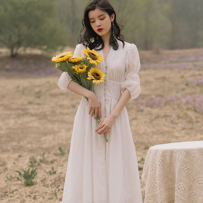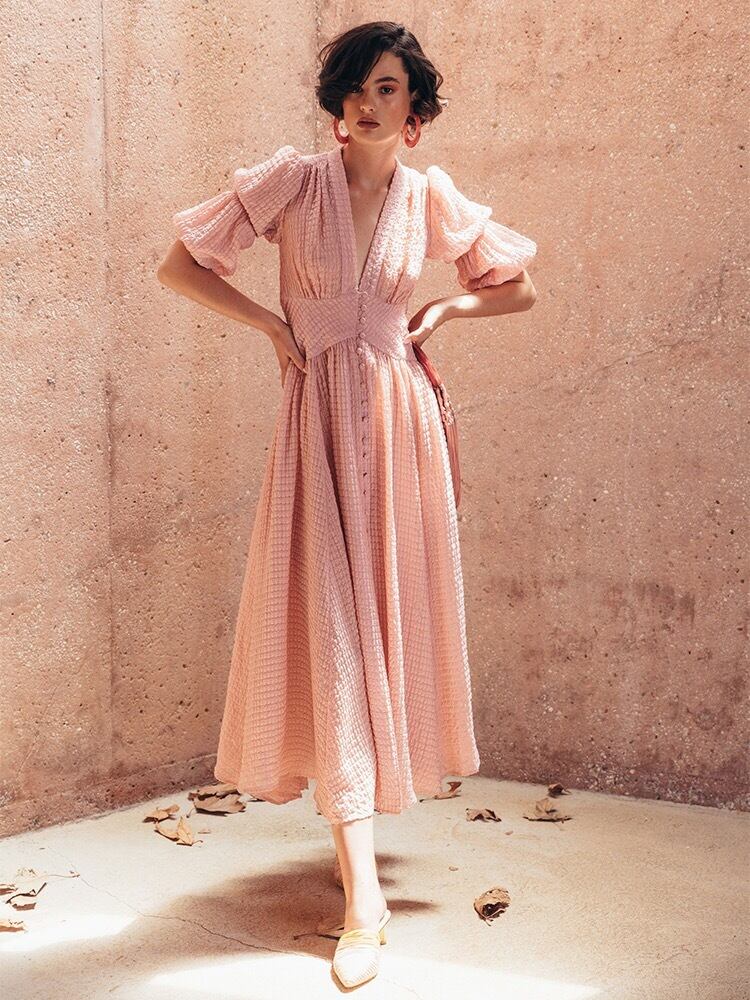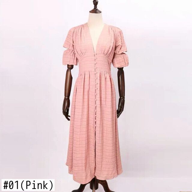 Pinkoz ソリッド レディース ドレス ディープ V ネック ランタン ウエスト ボタン シャーリング ミディ ドレス ホワイト ピンク セクシー ドレス Vネック ソリッドカラー