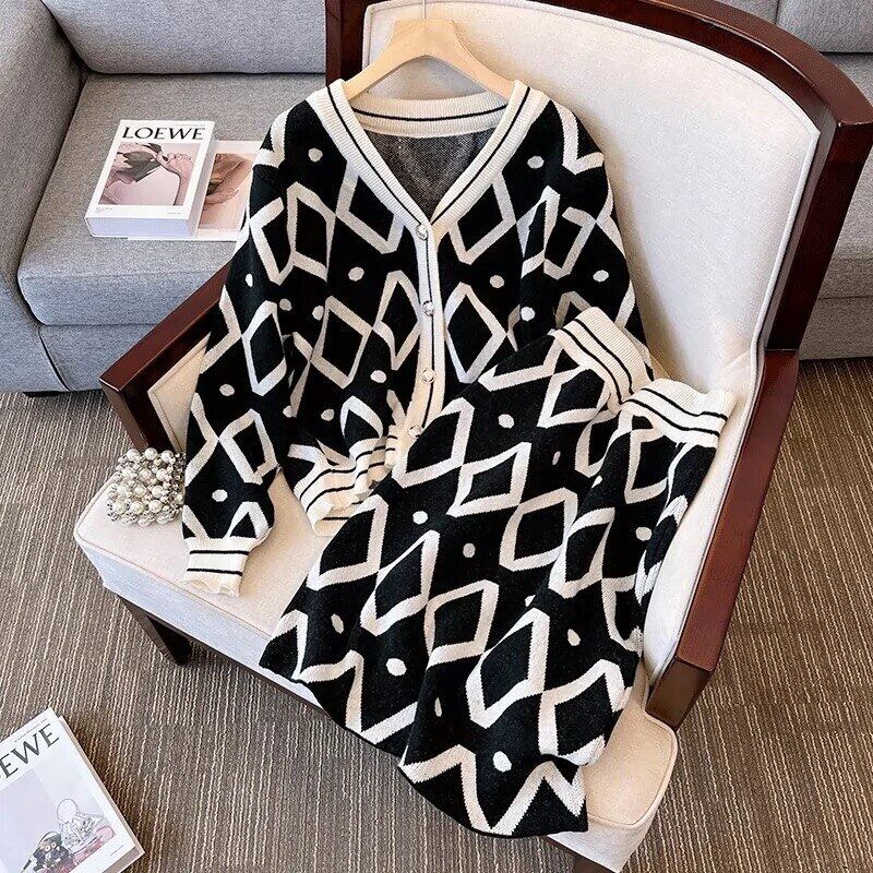 Pinkoz 女性デザイナー 2 点セット カーディガン ファッション韓国スタイル黒 V ネック トップス + ぬるぬる膝丈スカート衣装シック traf ピンク ブラック Vネック