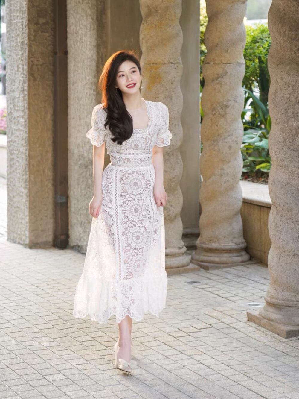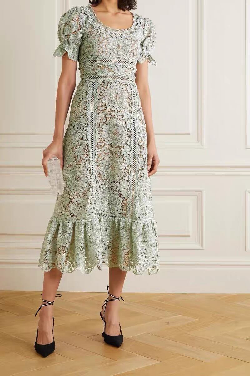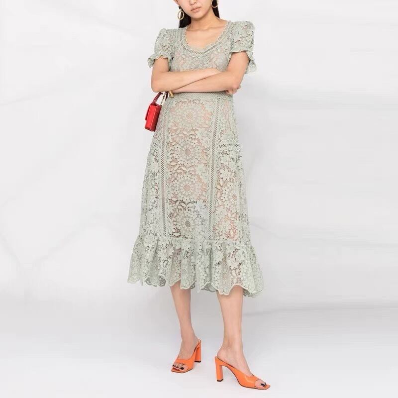 Pinkoz パーティードレス女性高級ライトグリーン U ネックレースミディ中空アウトデザイナー夏自由奔放に生きる女性服新 ピンク サマー 夏物