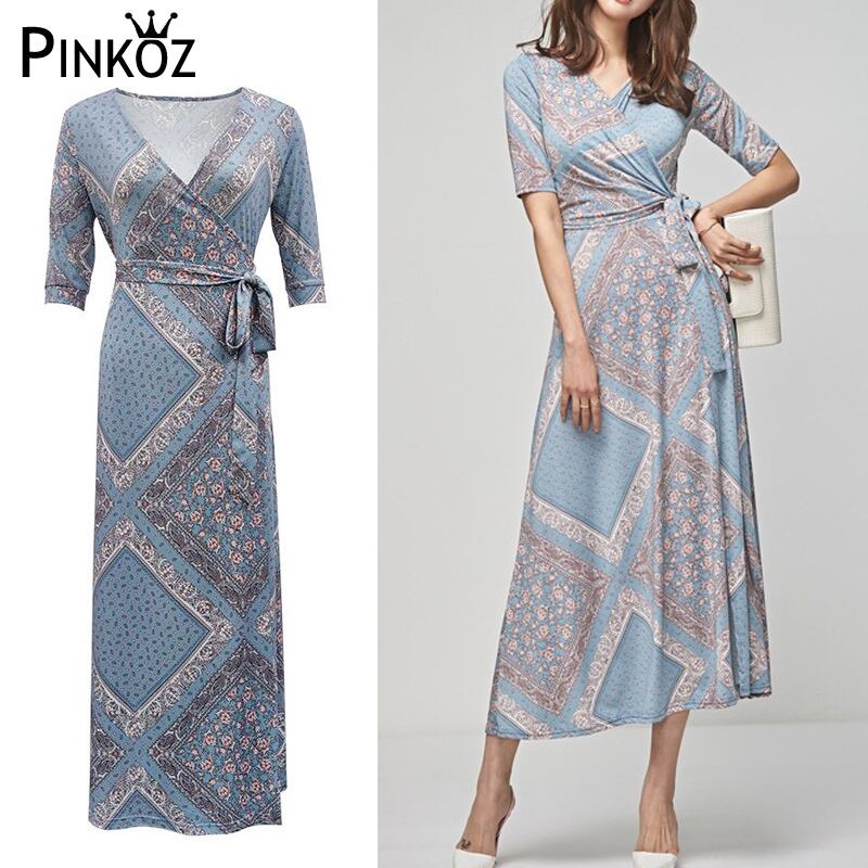 Pinkoz ライトブルー プリント レース アップ ラップ マキシ ドレス女性スリム セクシー な カジュアル v ネック半袖サマー ドレス ローブ韓国スタイル ピンク ハーフスリーブ 夏物 Vネック レースアップ