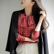 Pinkoz 女性赤チェーン パターン プリント弓襟ルーズ長袖カジュアル エレガント ブラウス ファム シックなシャツ ヴィンテージ弓レースアップ ロング ピンク レッド リボン フェミニン ビンテージ