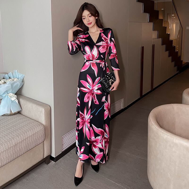 Pinkoz 女性ファッション赤花プリント v ネックラップマキシドレスレースアップペンシルカジュアルビッグサイズハーフスリーブドレス vestidos za ピンク レッド 半袖 Vネック フラワーデザイン
