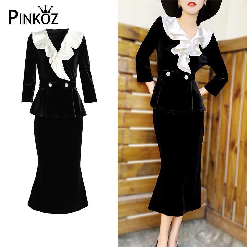Pinkoz レディース ピンク ブラック フリル ラッフル エレガント スカート Vネック