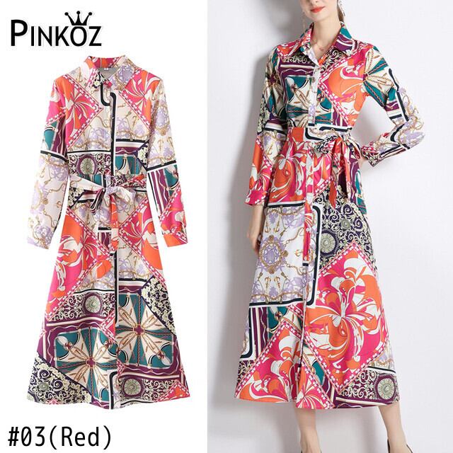 Pinkoz 女性シングルブレスト ロング ドレス ターン ダウン襟長袖エレガント カジュアル ビッグ サイズ花柄ドレス サッシ ローブ ピンク