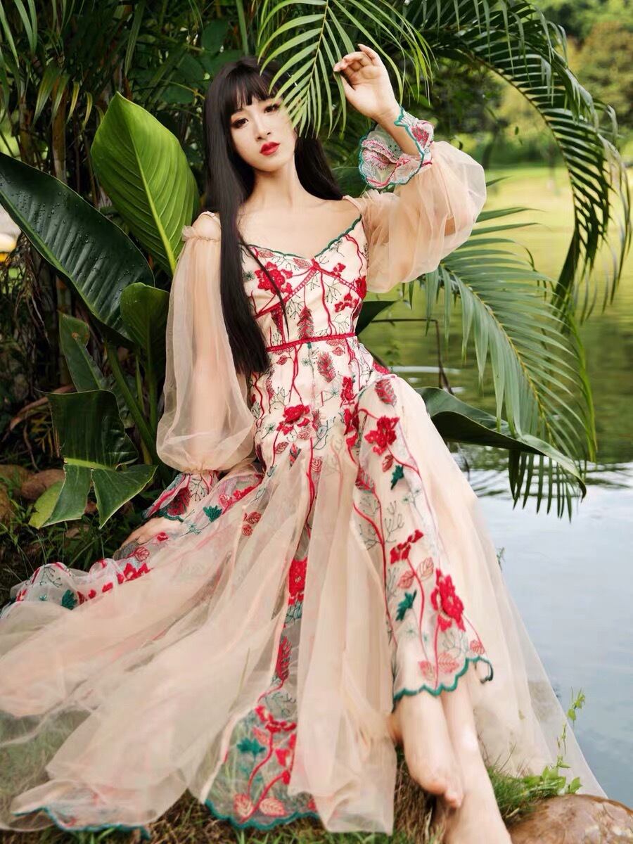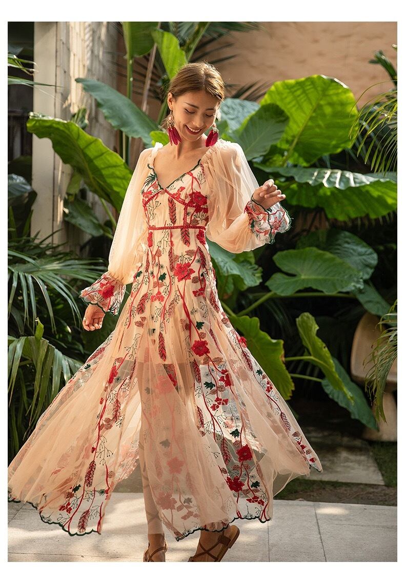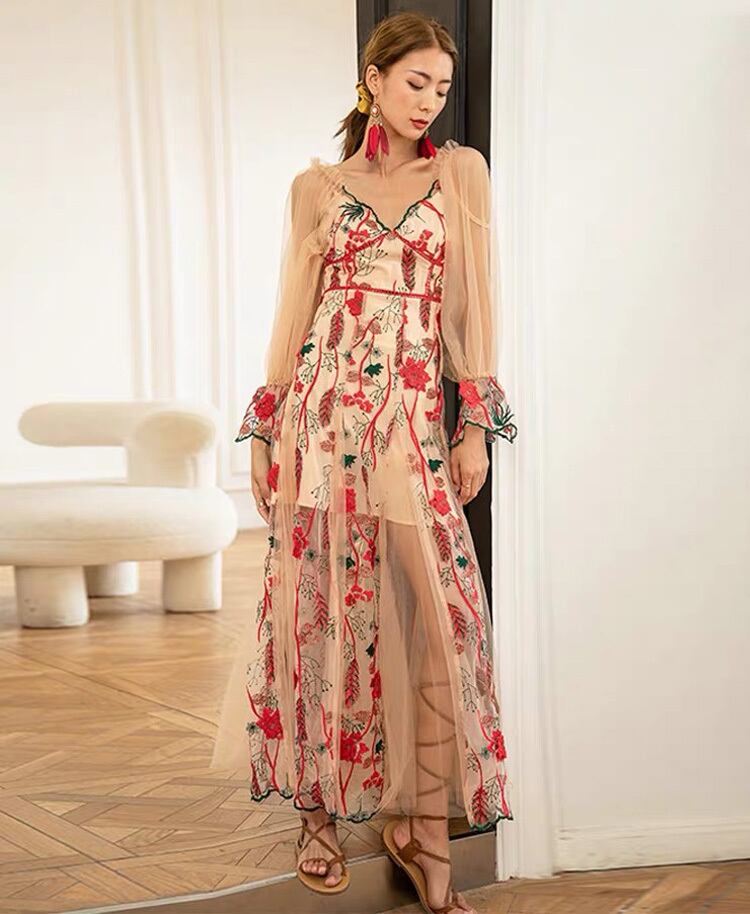 Pinkoz 高級パーティーマキシドレス女性の花刺繍ランタンスリーブメッシュスラッシュネック v ネックの誕生日ディナードレスファッション ピンク Vネック フラワーデザイン