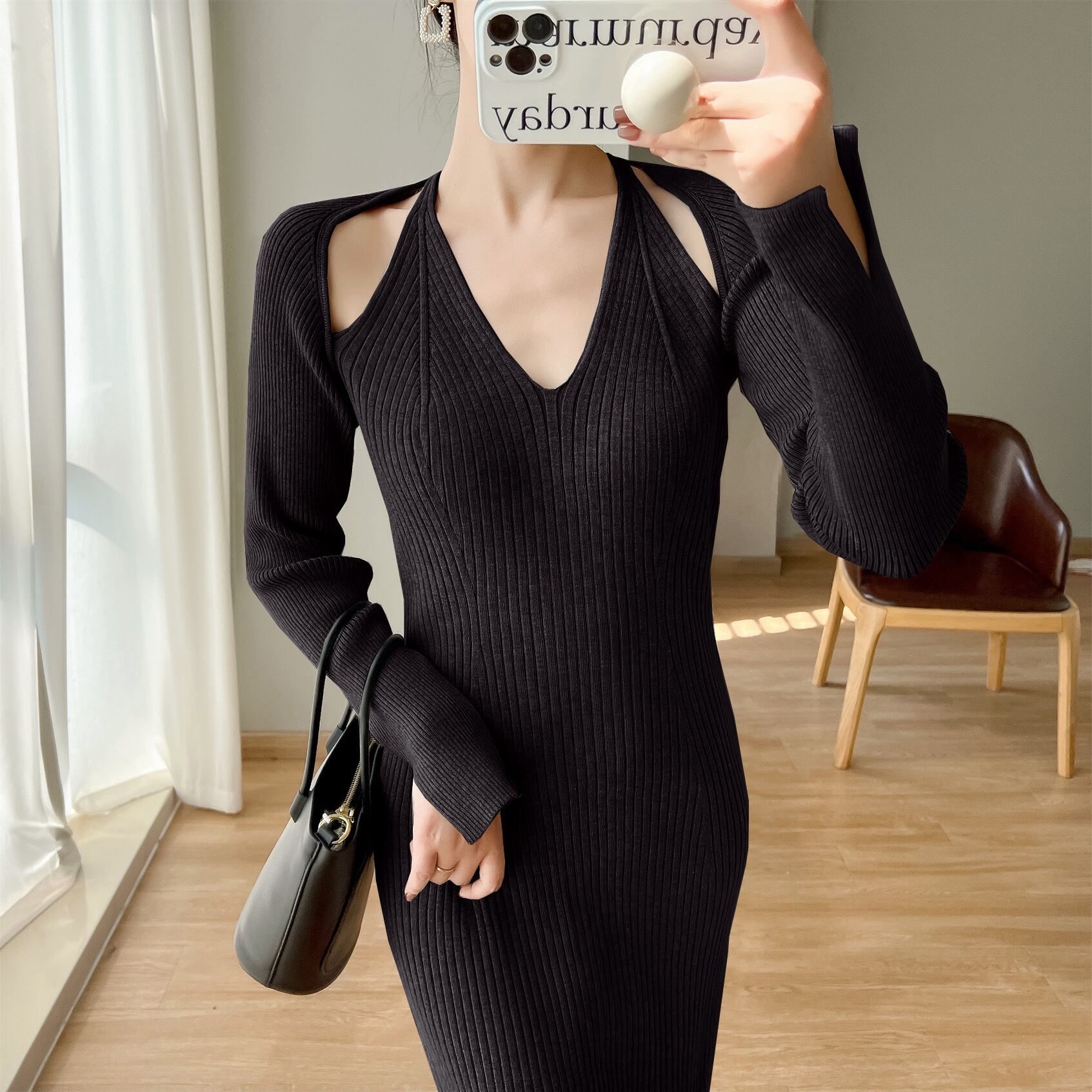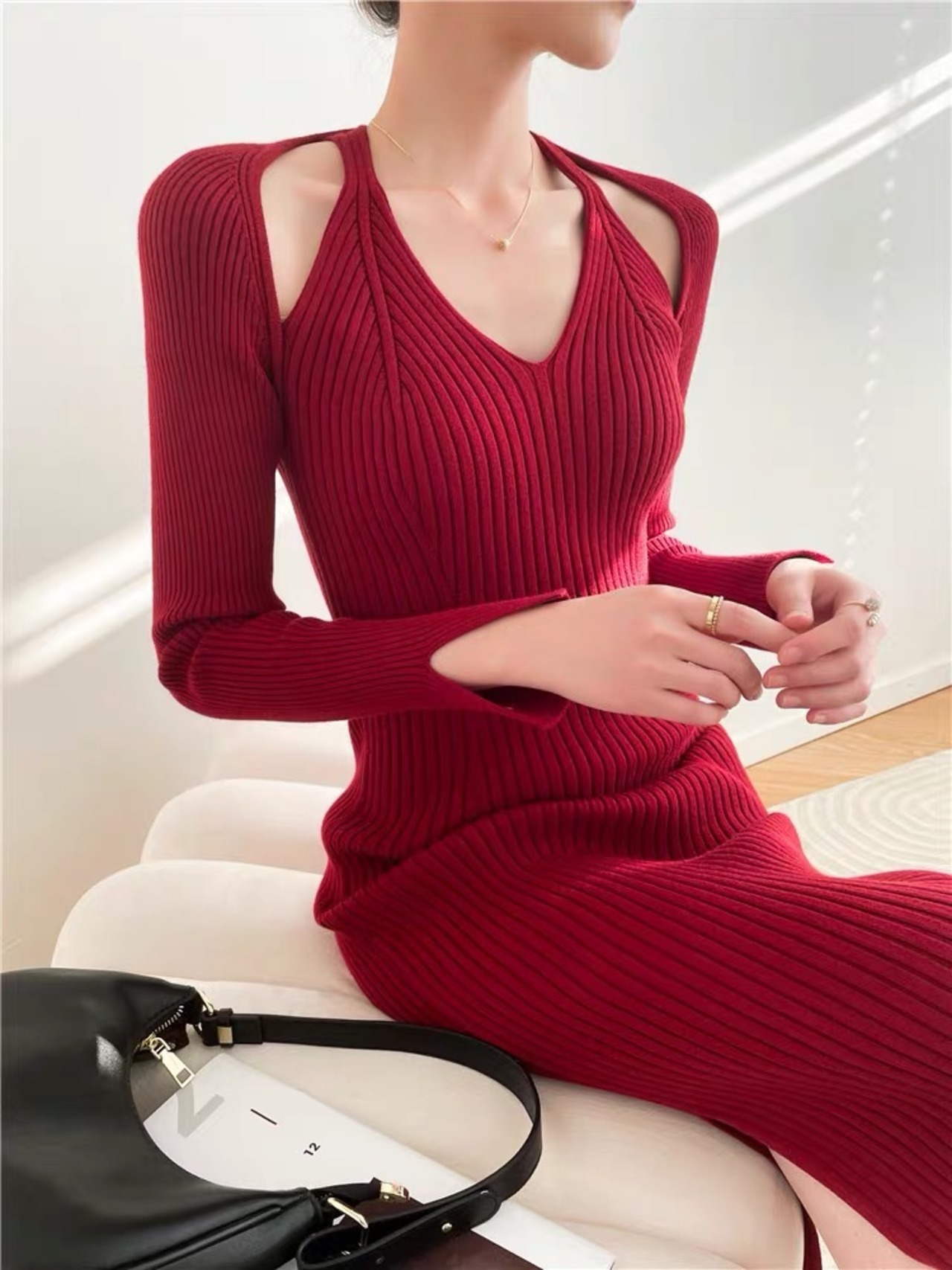 Pinkoz ヴィンテージファッション女性スリムミディドレスセクシーな v ネック赤フレンチニット秋無地シックなオフィスレディ vestidos traf ピンク レッド オータム 秋物 Vネック ソリッドカラー ビンテージ 会社 学校 通勤や通学にも
