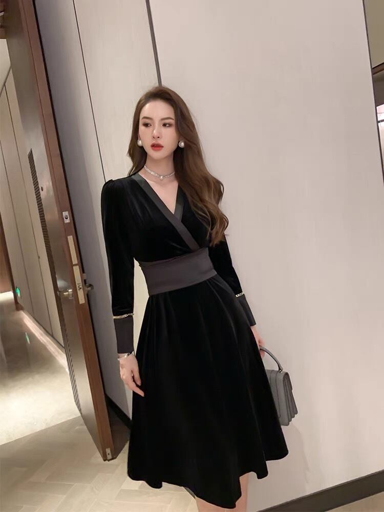 Pinkoz 女性デザイナー スタイリッシュなベルベット ブラック レースアップ弓 v ネック長袖秋冬オフィス レディ ロング vestidos ヴィンテージ traf ピンク リボン オータム 秋物 ウィンター 冬物 Vネック ビンテージ 会社 学校 通勤や通学にも