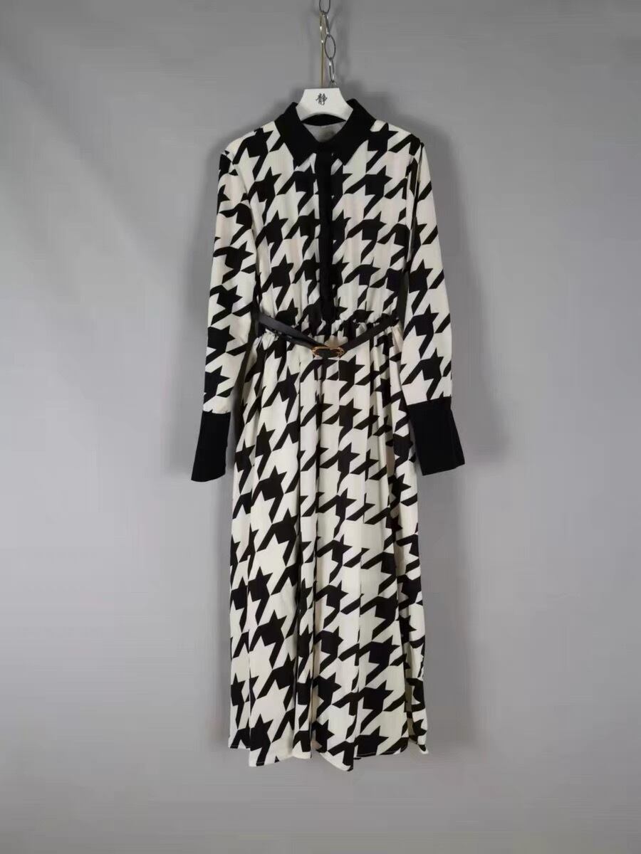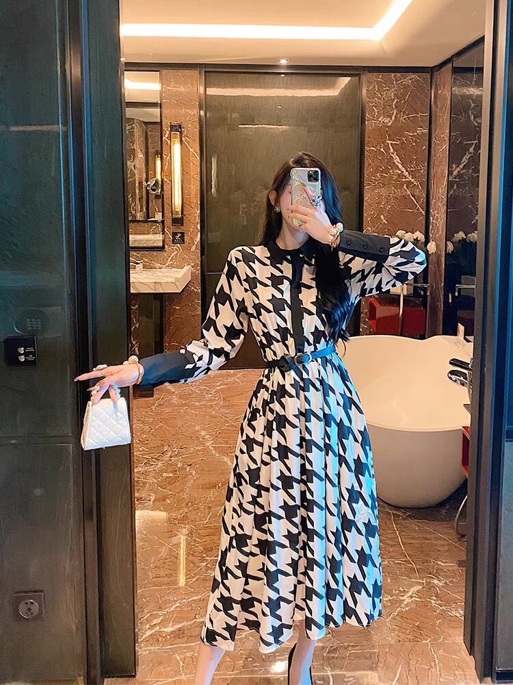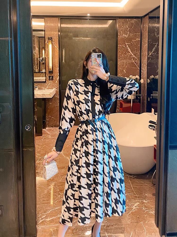 Pinkoz 黒千鳥格子柄プリントターンダウン襟春夏女性ミディドレス女性エレガントなフレンチローブベルト ピンク ブラック スプリング 春物 サマー 夏物 ハーネス